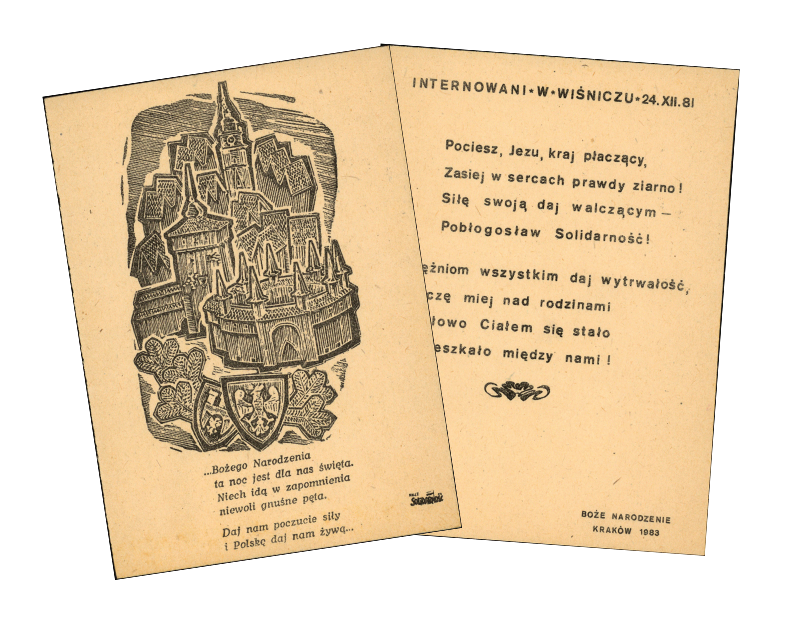 Do kartki załączono tekst napisany przez internowanych w stanie wojennym do melodii kolędy „Bóg się rodzi”