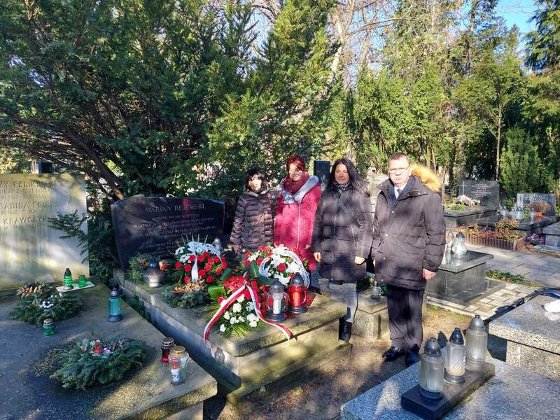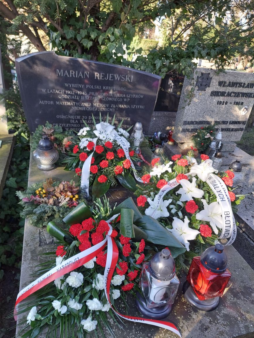 Zastępca Dyrektora IPN Gdańsk, prof. Mirosław Golon wraz z Dyrektor Szkoły Podstawowej im. Mariana Rejewskiego w Białych Błotach Danutą Ferenstain oraz delegacją nauczycieli złożył kwiaty na grobie Mariana Rejewskiego na warszawskich Powązkach.