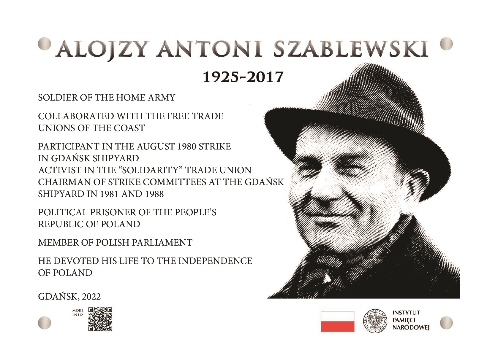 Alojzy Szablewski retired in 1990, but he remained a social activist. From 1991 to 1993 he served as a member of parliament from the lists of Catholic Electoral Movement, serving on the Economic System and Industry Commi ee, Social Policy Commi ee, and numerous subcommi ees. In 1991-1995 he belonged to the Christian-National Union, and subsequently, until 2000, to the Movement for Reconstruction of Poland. He was also active in the Association of Persecuted Persons “Godność” [“Dignity”], and from 2003 onwards – in the “Solidarni z Kolebki” [“In Solidarity from the Cradle”] Association. He never became a member in the Związek Bojowników o Wolność i Demokrację [Union of Fighters for Freedom and Democracy], as he considered it a Communist organization. He was awarded the Gold Cross of Merit, Commander Cross and Star of the Polonia Restituta Order, and the Freedom and Solidarity Cross. He also received the medals “For the Deserts to Gdańsk Region” and “For the Deserts to Gdańsk Shipyard”, as well as the “Deserving Maritime Industry Worker” badge.