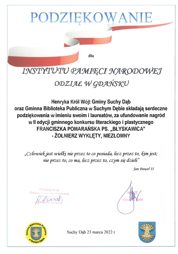 Patronat nad wydarzeniem objęli wójt gminy Suchy Dąb oraz Oddział IPN w Gdańsku.