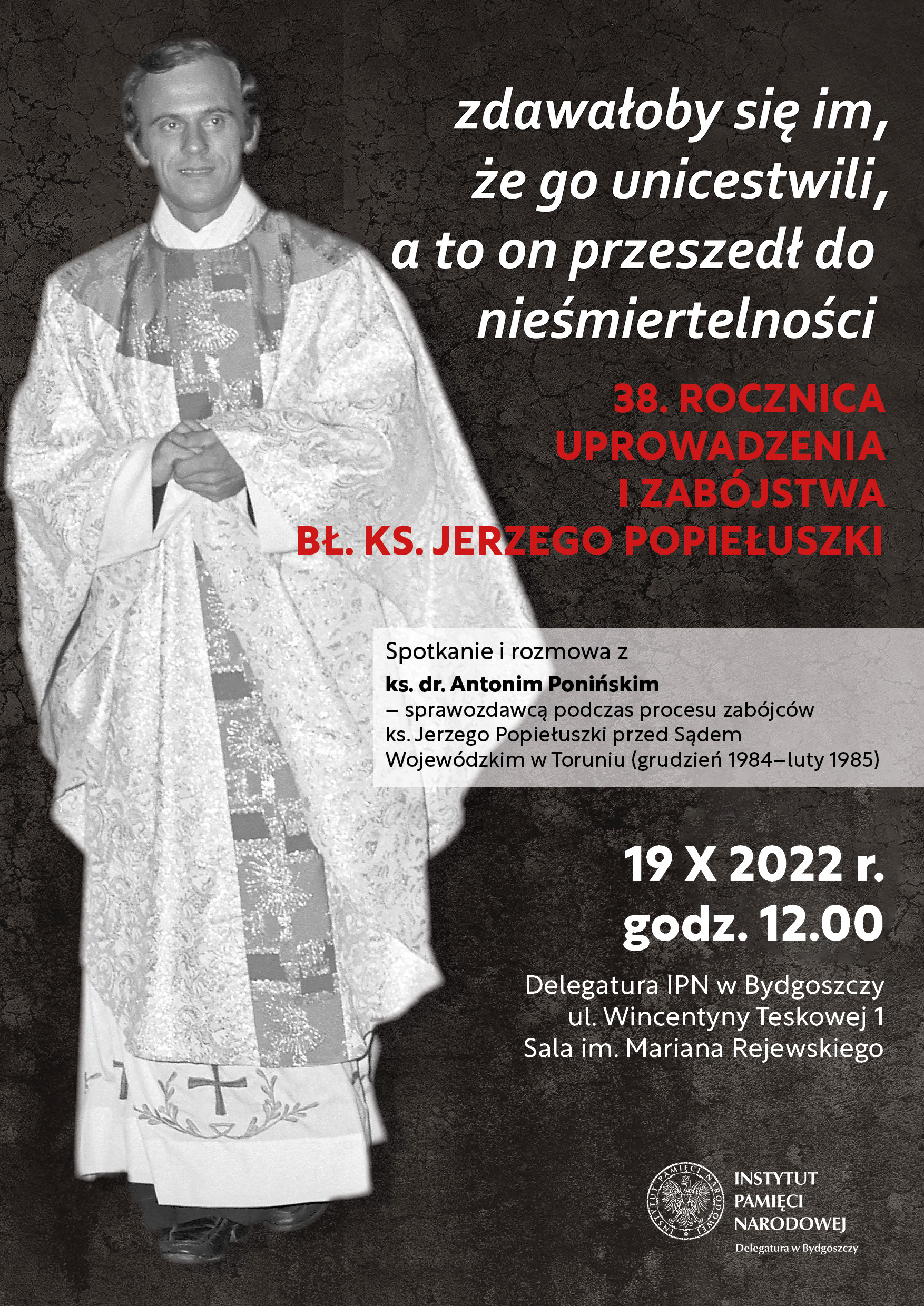 Spotkanie odbędzie się 19 października 2022 r. o godz. 12.00. w bydoskiej delegaturze IPN, ul. Teskowej 1, w Sali im. Mariana Rejewskiego.