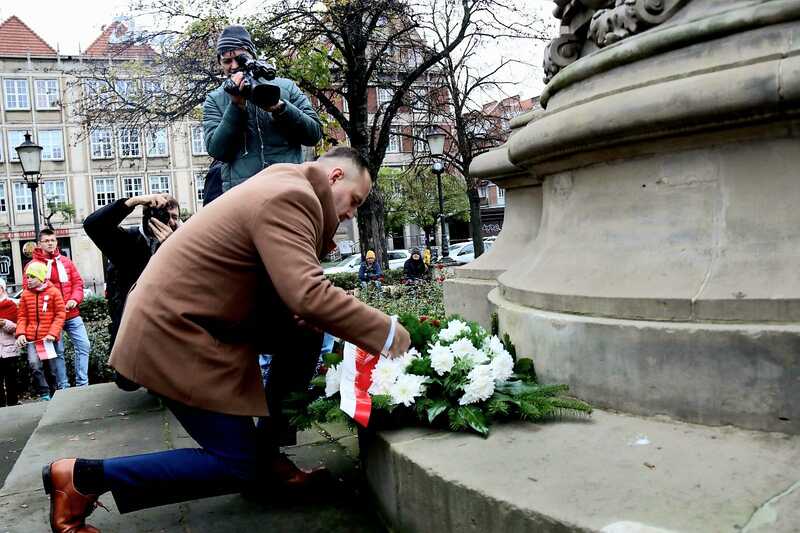 Parada Niepodległości przeszła następnie ulicami Kartuską i Nowe Ogrody – gdzie zostały złożone kwiaty przy pamiątkowych tablicach na historycznym budynku Komendy Miejskiej Policji w Gdańsku (ul. Nowe Ogrody 27). Jedna z tablic upamiętnia Komisariat Generalny RP w Wolnym Mieście Gdańsku, który mieścił się tam w latach 1921–1939, a w czasie II wojny światowej w gmachu była siedziba gestapo. Druga tablica odnosi się do rocznicy zaślubin Polski z morzem (1920).