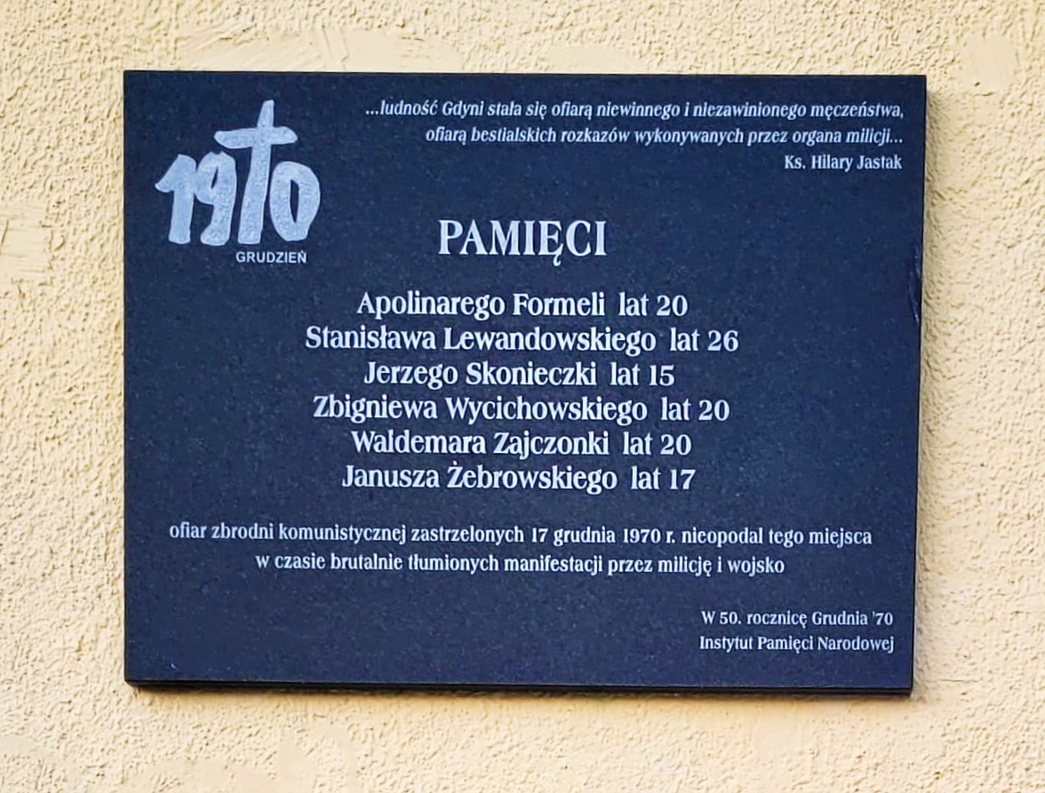 Pracownicy Oddziałowego Biura Upamiętniania Walk i Męczeństwa IPN w Gdańsku złożyli kwiaty pod tablicą poświęconą młodym ofiarom zbrodni komunistycznej, zastrzelonym w Grudniu '70 przez milicję i wojsko w okolicach przystanku SKM w Gdyni Wzgórzu Św. Maksymiliana. Tablica upamiętnia: Apolinarego Formelę l. 20, Stanisława Lewandowskiego l. 26, Jerzego Skonieczkę l. 15, Zbigniewa Wycichowskiego l. 20, Waldemara Zajczonka l. 20 oraz Janusza Żebrowskiego l. 17).