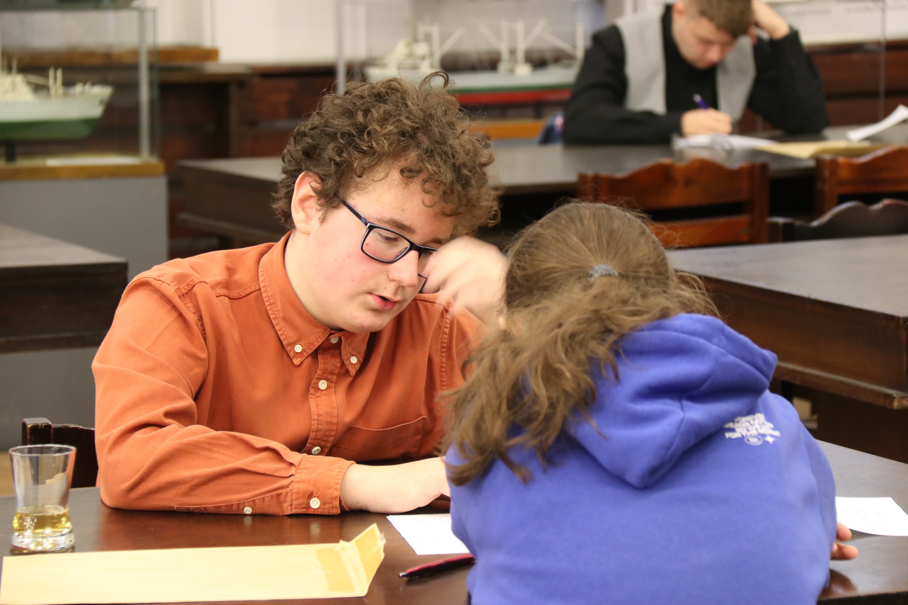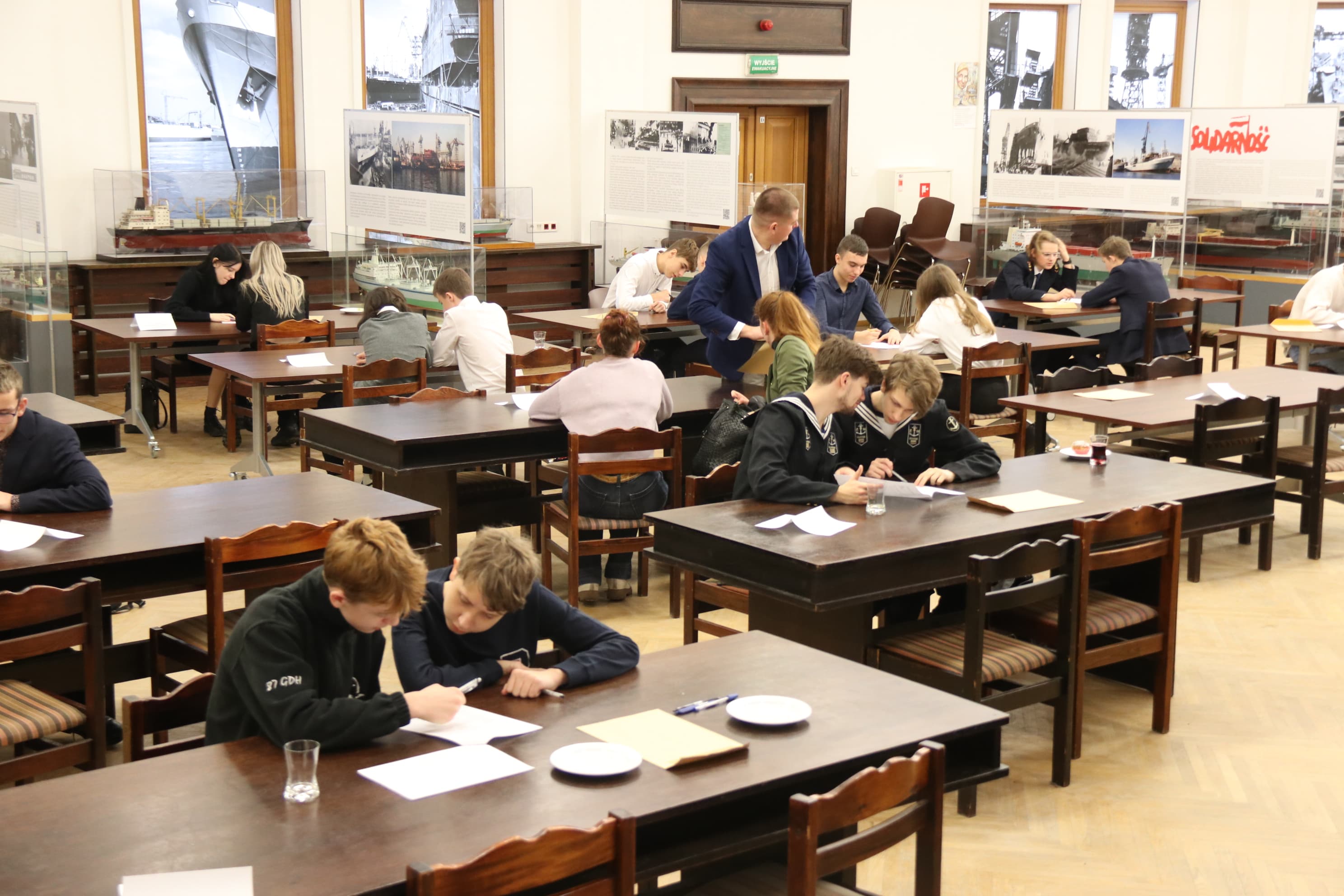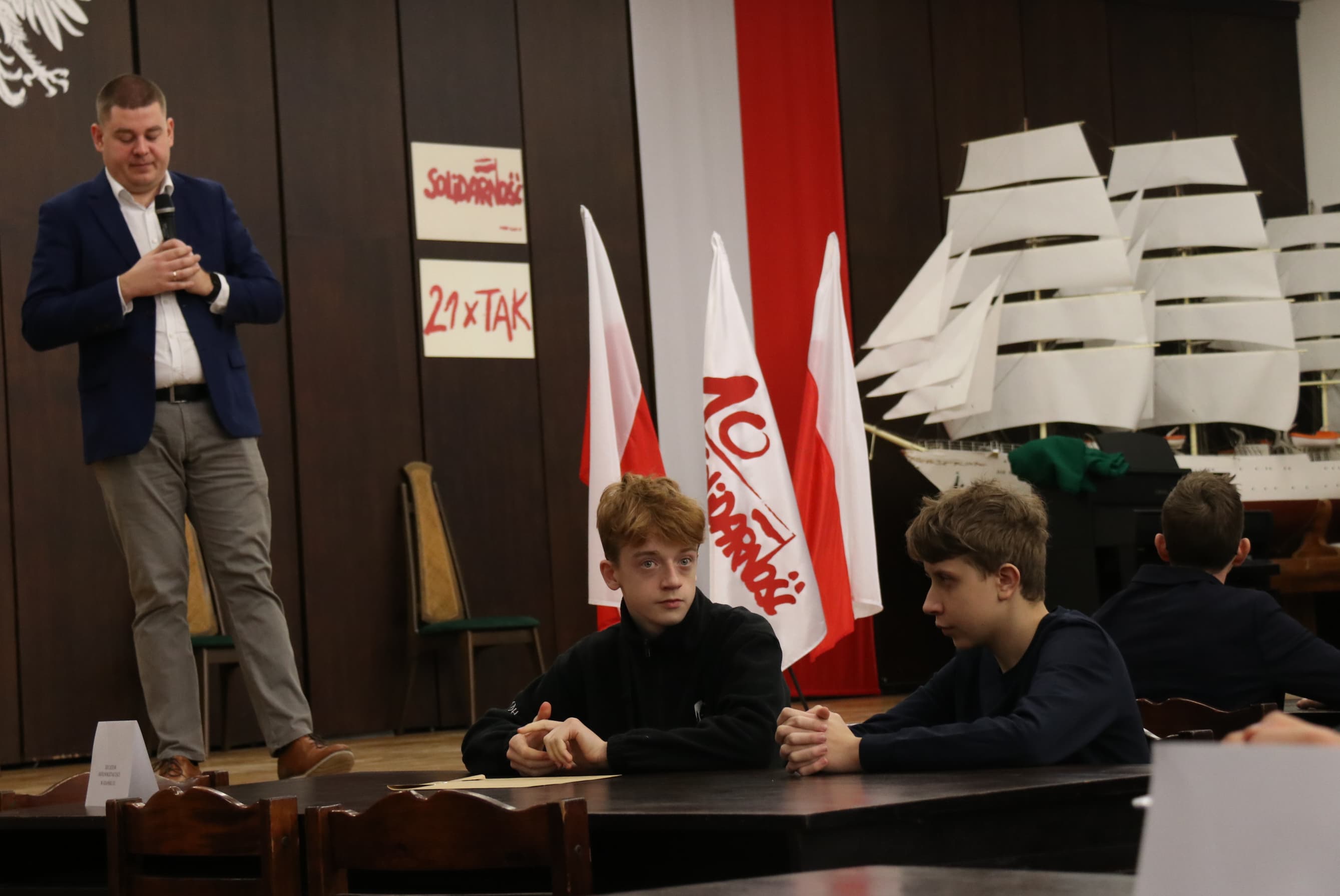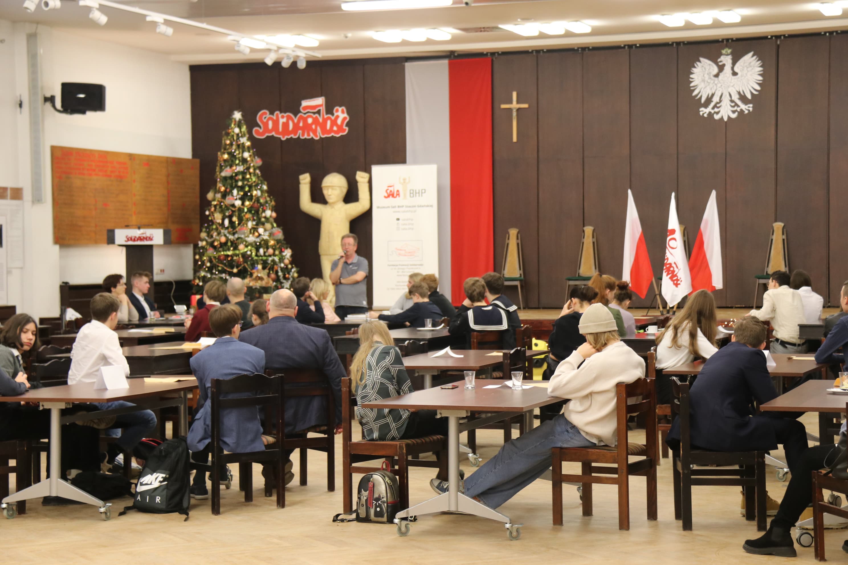 W trakcie przerwy uczniowie wysłuchali prelekcji na temat historii Sali BHP, Sierpnia '80 i stanu wojennego. Przeprowadził ją Jarosław Żurawiński z Fundacji Promocji Solidarności.