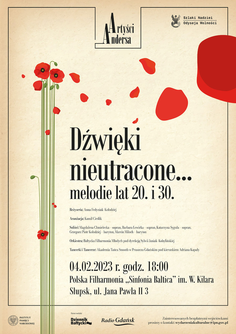 Instytut Pamięci Narodowej zaprasza na koncert „Dźwięki nieutracone” z cyklu „Artyści Andersa”, który odbędzie się 4 lutego 2023 r. o godz. 18.00 w słupskiej filharmonii Sinfonia Baltica im. W. Kilara.