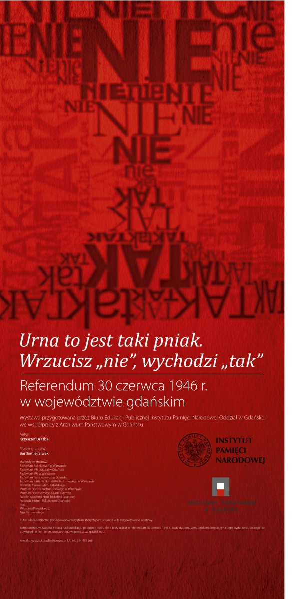 Wystawa została przygotowana 65 lat po referendum z 30 czerwca 1946 r., które stało się mitem założycielskim komunizmu w Polsce. Ekspozycja odsłania kulisy i mechanizm fałszerstw wyborczych komunistów oraz wpływ propagandy na postawy wyborców. Przybliża również nastroje społeczeństwa oraz atmosferę życia w Polsce pierwszych lat powojennych na przykładzie ówczesnego województwa gdańskiego. Na wystawie zobaczyć można m.in. plakaty i hasła propagandowe z okresu tzw. kampanii przedreferendalnej, a także dowody fałszerstw dokonanych przez komunistów. Materiały do wystawy pochodzą z kilkunastu placówek naukowych i zbiorów prywatnych.
