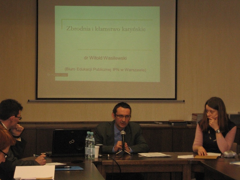 Uczestnicy seminarium zapoznali się z najważniejszymi faktami dotyczącymi Zbrodni Katyńskiej oraz kłamstwa katyńskiego, które w sposób syntetyczny przedstawił dr Witold Wasilewski z Biura Edukacji Publicznej z Centrali IPN w Warszawie. Prelegent opowiedział także na szereg szczegółowych pytań, które pojawiły się w trakcie dyskusji po jego wystąpieniu. Z równym zainteresowaniem nauczyciele wysłuchali także wystąpienia mecenasa Romana Nowosielskiego, który jest jednym z trzech pełnomocników rodzin ofiar katyńskich przed Europejskim Trybunałem Praw Człowieka w Strasburgu.