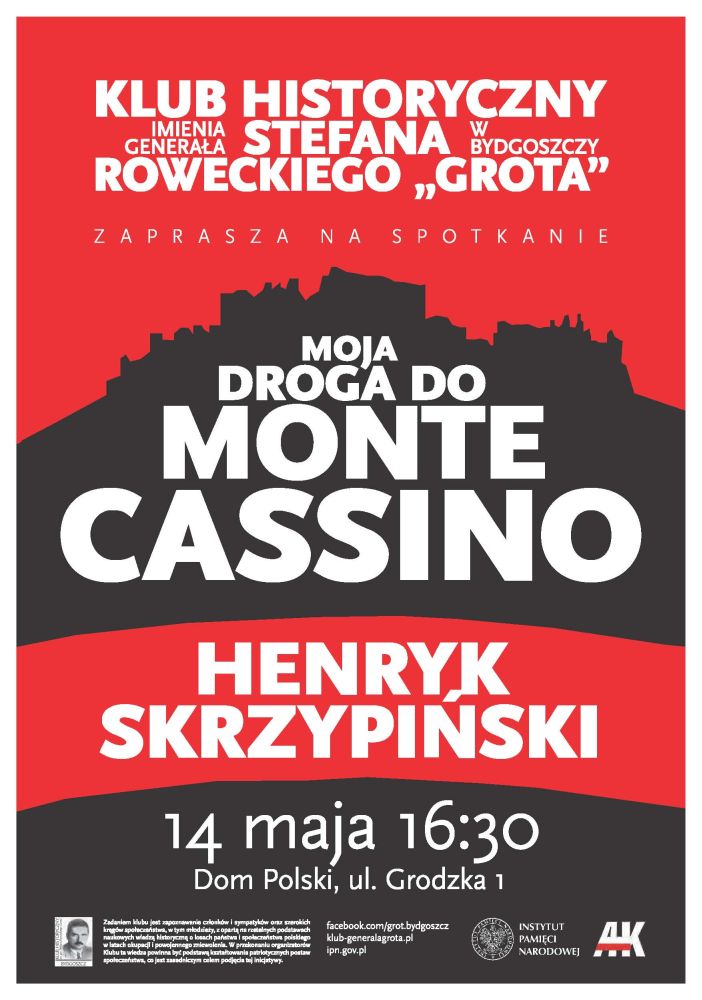 W maju tego roku przypada kolejna, 69. już rocznica bitwy o Monte Cassino. Z tej okazji 14 maja br. (w środę) w Domu Polskim przy ul. Grodzkiej 1 w Bydgoszczy rozpocznie się o godz. 16.30 spotkanie zatytułowane „Moja droga do Monte Cassino”. Jego głównym bohaterem będzie bydgoszczanin Henryk Skrzypiński, żołnierz 2 Korpusu Polskiego gen. Władysława Andersa i znawca dziejów tego związku taktycznego Polskich Sił Zbrojnych na Zachodnie (PSZ).