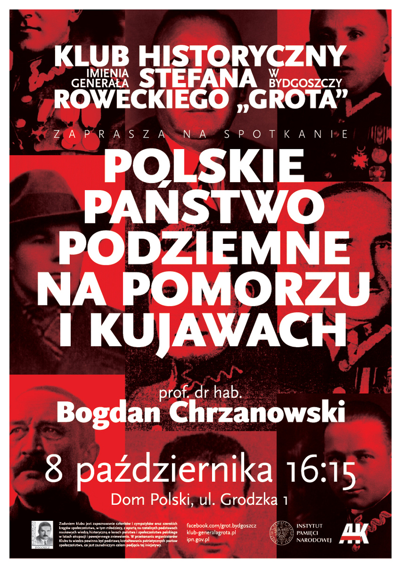 8 października br. (we wtorek) w Domu Polskim przy ul. Grodzkiej 1 rozpocznie się o godz. 16.15 spotkanie, na którym zostanie wygłoszony wykład pt. „Polskie Państwo Podziemne na Pomorzu i Kujawach".