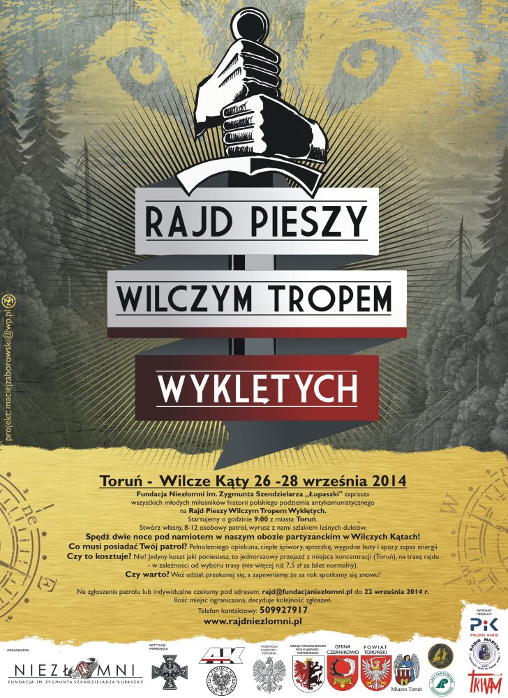 W dniach 26–28 września br. (piątek-niedziela) odbędzie się Rajd Pieszy Wilczym Tropem Wyklętych. Rajd, który rozpocznie się w Toruniu o godz. 9.00, ma charakter zespołowej gry patrolowej. Uczestnicy (zgrupowani w patrole) przemierzają wyznaczoną trasę wcielając się jeden z oddziałów podziemia niepodległościowego. Baza rajdu znajduje się wśród borów bydgoskich, nieopodal królowej Polskich rzek, Wisły, w siedlisku Wilcze Kąty.