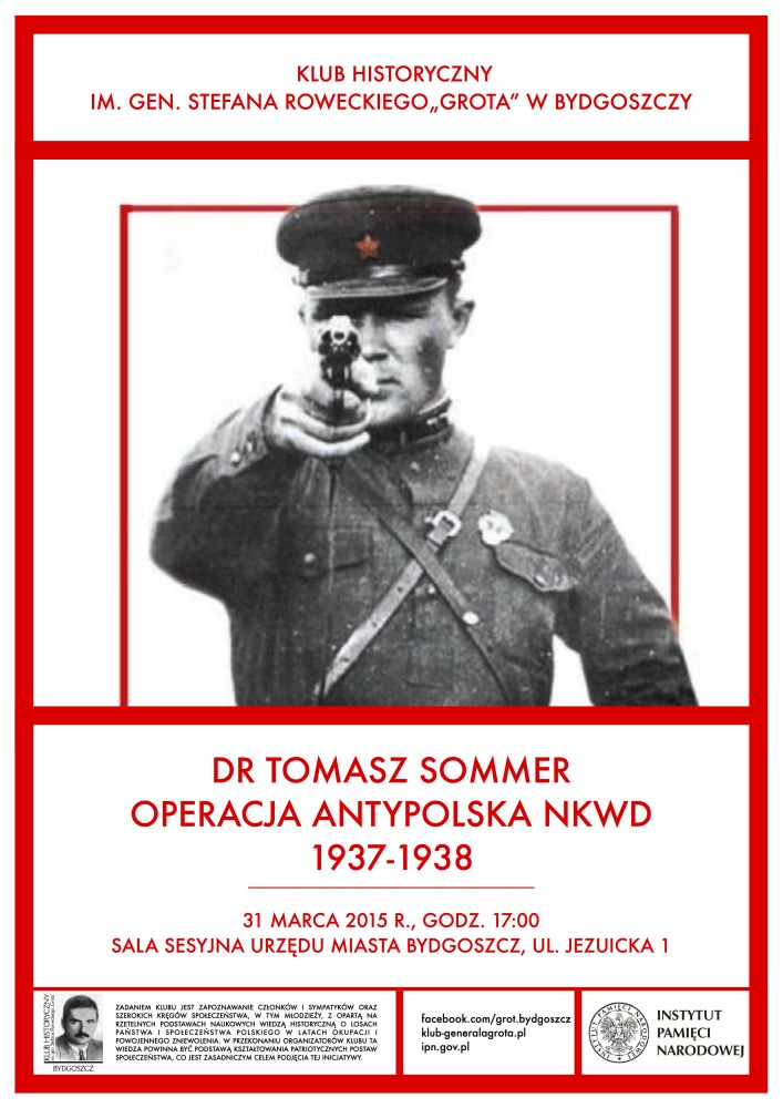 Klub Historyczny im. gen. Stefana Roweckiego „Grota” w Bydgoszczy oraz Instytut Pamięci Narodowej Oddział w Gdańsku – Delegatura w Bydgoszczy zapraszają na wykład dr. Tomasza Sommera „Operacja Antypolska NKWD 1937–1938”.