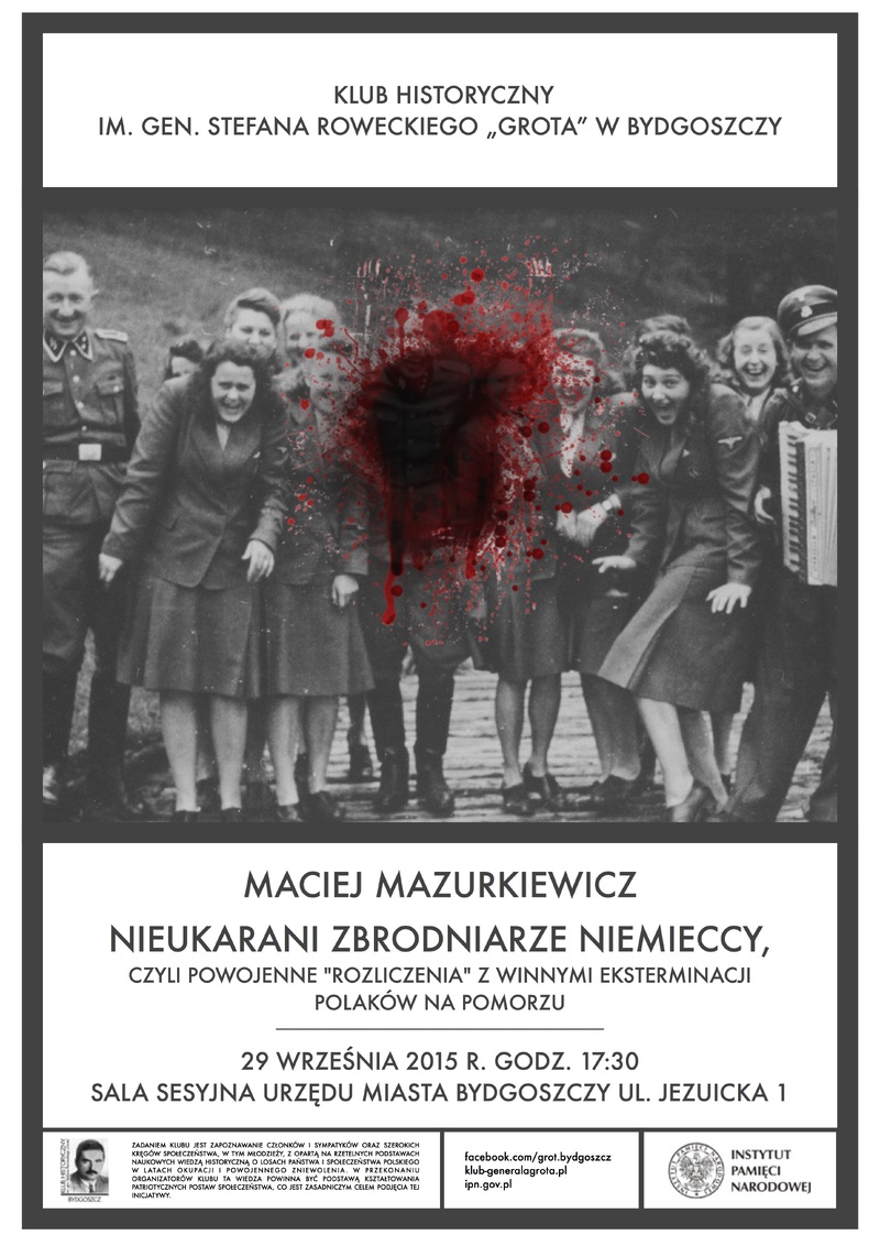 29 września br. w Sali Sesyjnej Urzędu Miasta w Bydgoszczy odbyło się spotkanie z Maciejem Mazurkiewiczem, przeprowadzone w ramach działalności Klubu Historycznego im. gen. Stefana Roweckiego „Grota”. Spotkanie otworzył dr Marek Szymański, kierujący pracą pionu naukowego IPN w Bydgoszczy. Gość spotkania przedstawił wykład pt. „Nieukarani zbrodniarze niemieccy, czyli powojenne »rozliczenia« z winnymi eksterminacji Polaków na Pomorzu”.