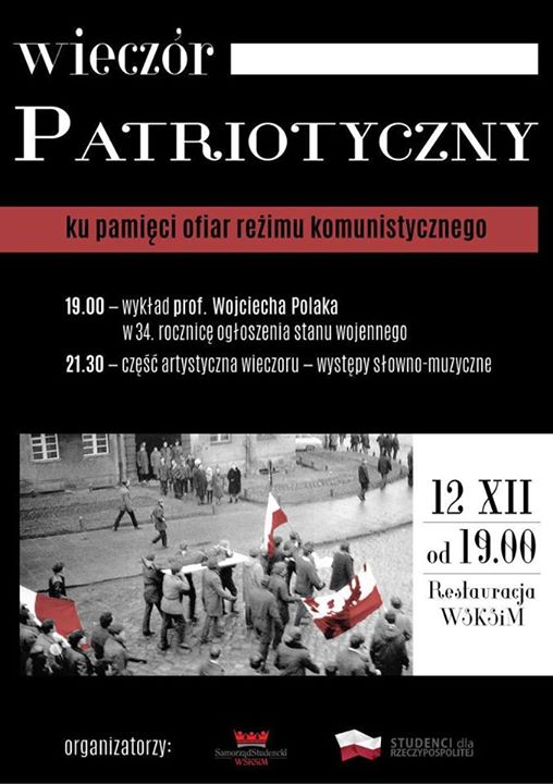 Instytut Pamięci Narodowej Oddział w Gdańsku – Delegatura w Bydgoszczy zaprasza na wieczór patriotyczny poświęcony pamięci ofiar reżimu komunistycznego. Pretekstem do spotkania jest przypadająca 34. rocznica wprowadzenia stanu wojennego. Wydarzeniu towarzyszyć będzie prezentacja przygotowanej przez Instytut Pamięci Narodowej wystawy „586 dni stanu wojennego”. Spotkanie poprowadzi Łukasz Żmuda, przedstawiciel Stowarzyszenia Studenci dla Rzeczpospolitej.
