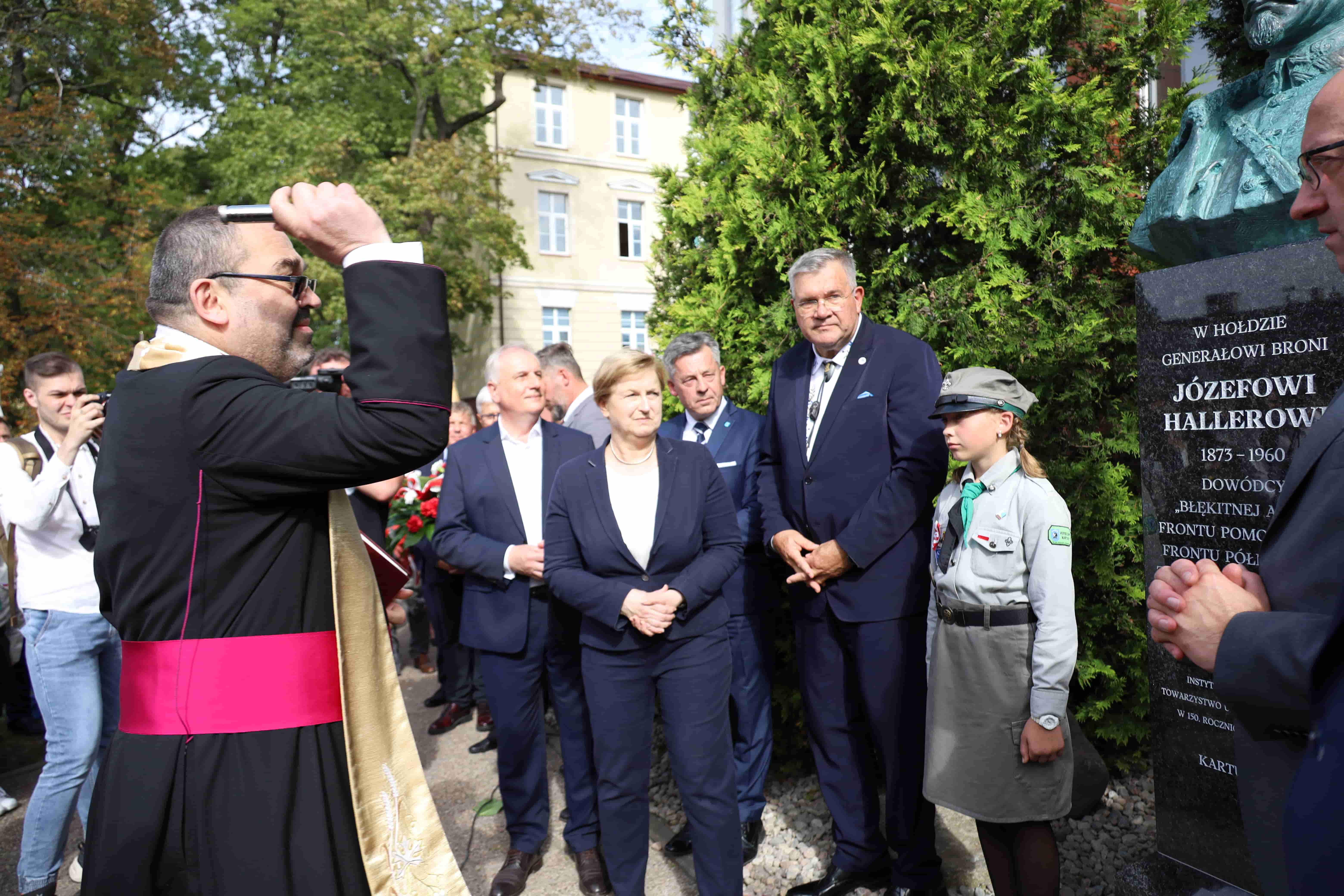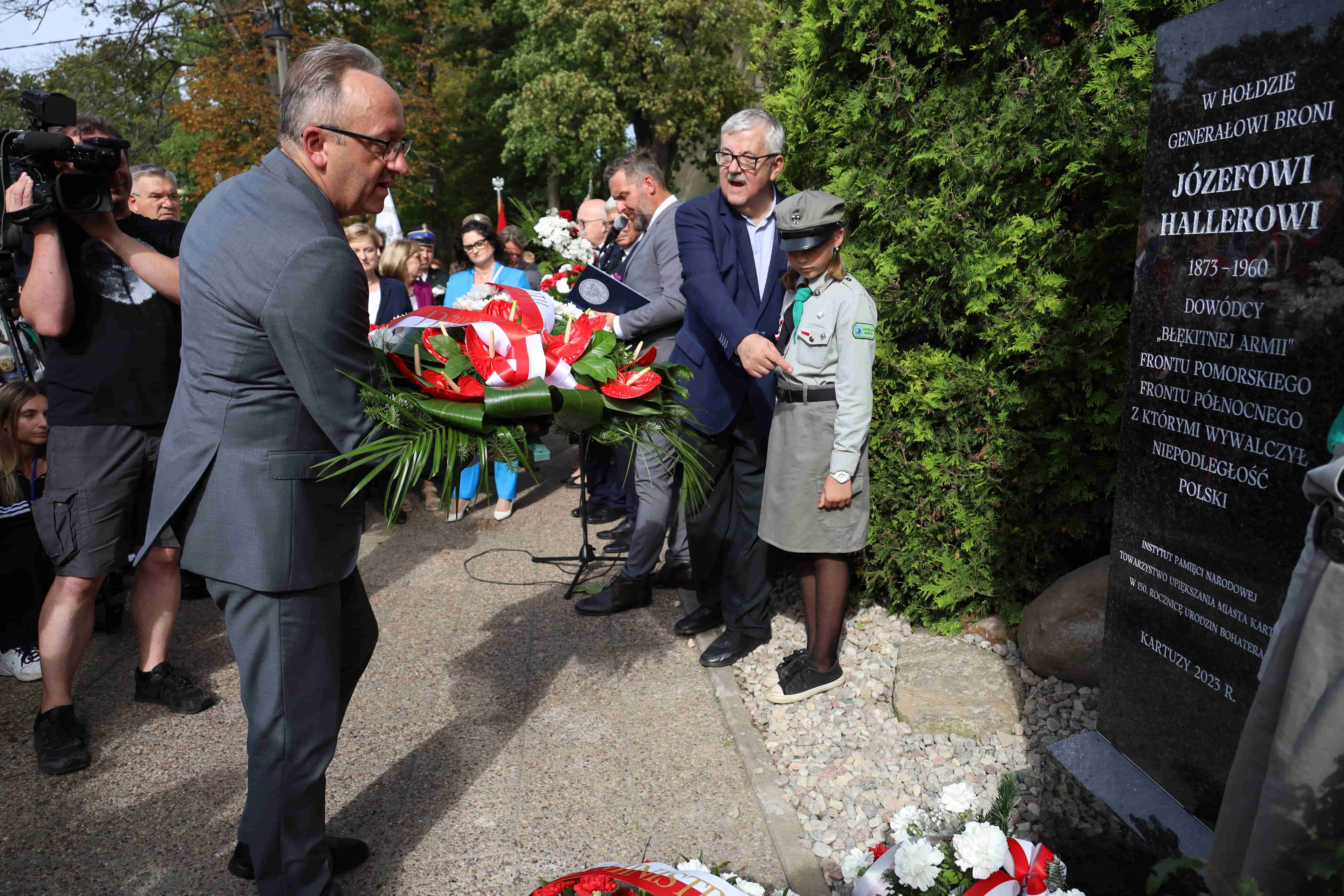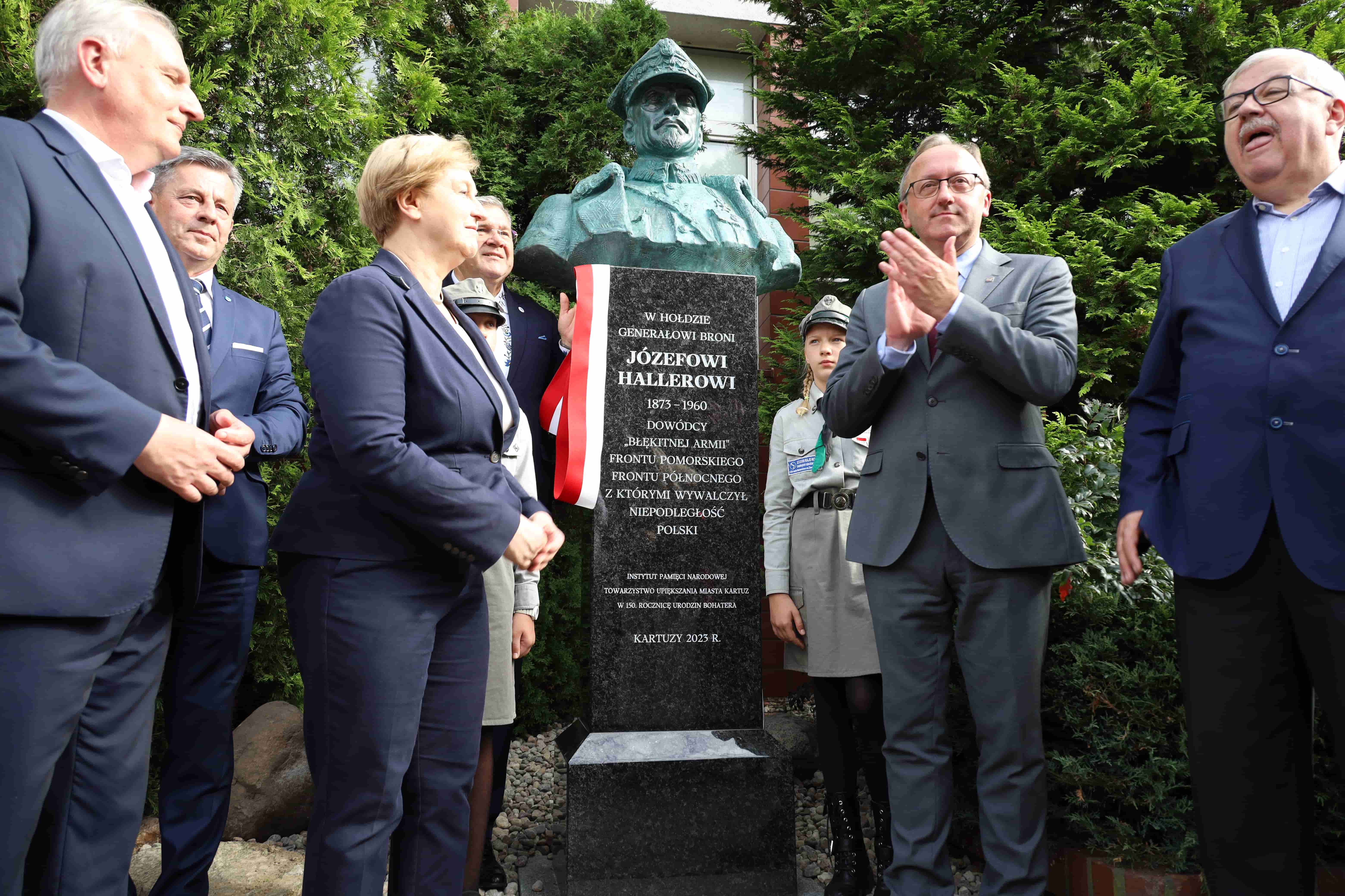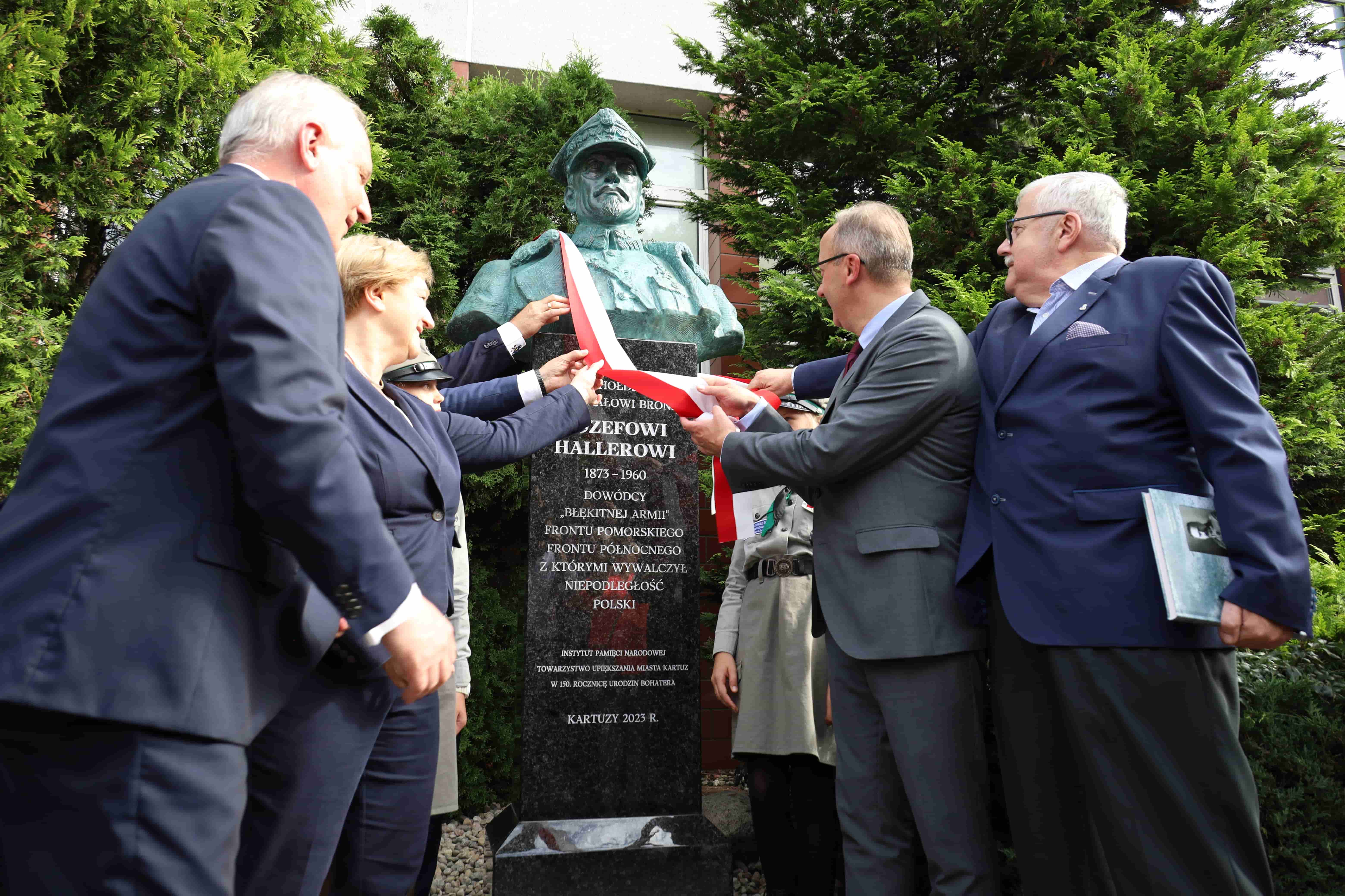 Następnie głos zabrał prezes Towarzystwa Upiększania Miasta Kartuzy Kazimierz Socha-Borzestowski, który podkreślił, że gen. Haller w Kartuzach był trzykrotnie, pierwszy raz w lutym 1920 r., po symbolicznych zaślubinach Polski z Bałtykiem, 3 listopada 1922 r. przybył na uroczystość poświęcenia sierocińca oraz 14 sierpnia 1927 r. na uroczystość odsłonięcia i poświęcenia figurki Matki Boskiej Królowej Korony Polskiej w Parku Miejskim. Dodał, że w Kartuzach po jednej stronie stoi pomnik gen. Hallera, a po drugiej marszałka Piłsudskiego, a pomiędzy nimi Matka Boska.