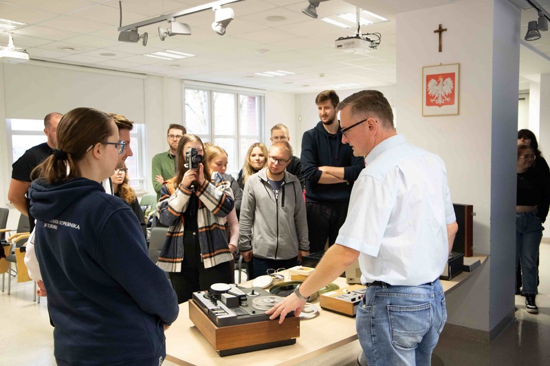 Studentom przedstawiono zadania ustawowe Instytutu Pamięci Narodowej oraz zakres i sposób ich realizacji przez Oddziałowe Archiwum IPN w Gdańsku. Następnie Grzegorz Kuźma poprowadził lekcję archiwalną pt. „Materiały audiowizualne zgromadzone w Oddziałowym Archiwum IPN w Gdańsku” połączoną z prezentacją multimedialną oraz filmem podczas której studenci zapoznali się z charakterem dokumentacji filmowej i dźwiękowej tworzonej przez organa bezpieczeństwa PRL, celami jej powstania i technicznymi sposobami zapisu obrazu oraz dźwięku. Omówiono również proces digitalizacji materiału zarejestrowanego na taśmach magnetycznych. Po zakończeniu filmu i prelekcji odbyła się krótka dyskusja, po czym zaprezentowano sprzęt zgromadzony przez archiwum, m.in. oryginalne magnetofony i magnetowidy z okresu PRL oraz taśmy filmowe 8, 16 i 35 mm, kasety Sanyo VT-30C a także przybliżono obsługę kamery analogowej 8 mm.