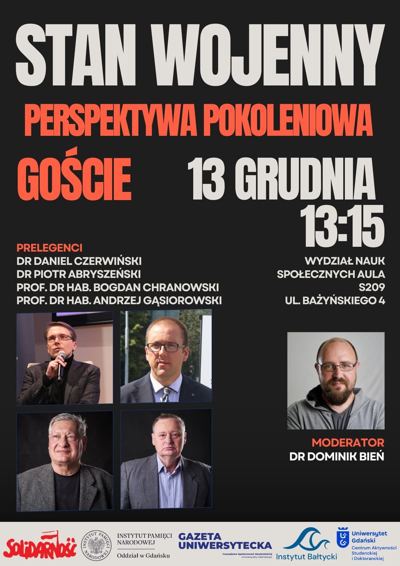 Prelegentami dyskusji będą: dr Daniel Czerwiński, dr Piotr Abryszeński, dr hab. Bogdan Chrzanowski, dr hab. Andrzej Gąsiorowski; prowadzenie: dr Dominik Bień.