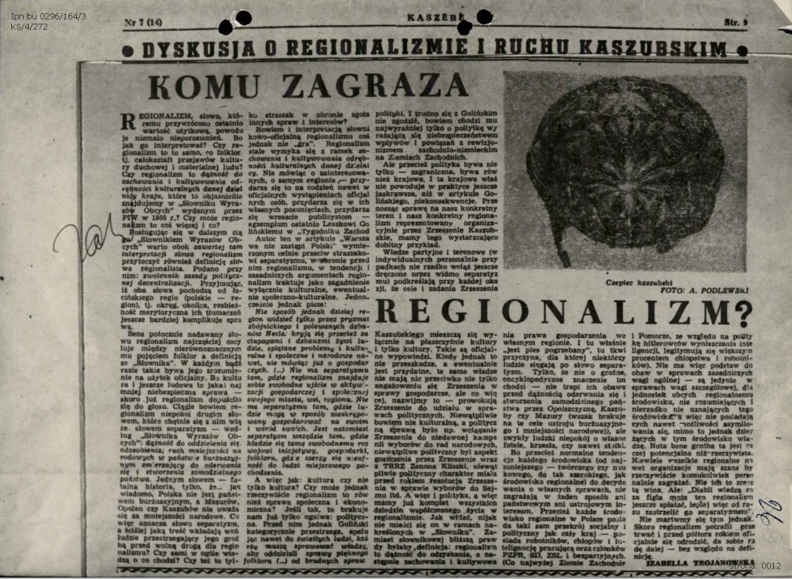O tym, że poglądy I. Trojanowskiej na temat regionalizmu kaszubskiego nie były po myśli władz, świadczyć mogą m.in. losy jednego z jej artykułów. Chodzi o tekst pt. „Komu zagraża regionalizm”, w którym autorka krytykowała ówczesne władze niemal nieustannie obawiające się separatyzmu na Kaszubach. Miał on ukazać się w wychodzącym na Pomorzu w latach 1957-1961 dwutygodniku „Kaszëbë”, został jednak cofnięty przez cenzurę a jego kopia trafiła nawet do akt SB.