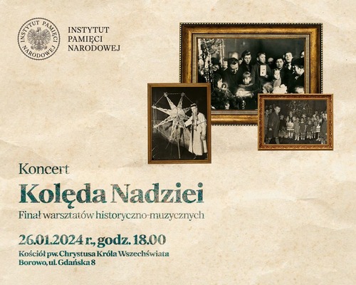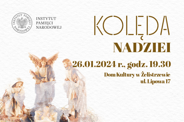 Instytut Pamięci Narodowej zaprasza na wyjątkowy koncert Kolęda nadziei, który odbędzie się 26 stycznia o godz. 19.30 w Domu Kultury w Żelistrzewie. Obok popularnych kolęd i pastorałek wykonane zostaną również przepełnione nadzieją kolędy, które powstały w trudnych dla Polski momentach historycznych (Lulajże, Jezuniu, na polskiej ziemi z 1942 r.; Kolęda łagrowa z 1942 r., Bóg się rodzi, Pan nad Pany z 1918 r.). Są one pięknym świadectwem polskiego ducha, którego niełatwo zgasić, a który zdolny był przezwyciężyć własną niemoc i plany okupanta.