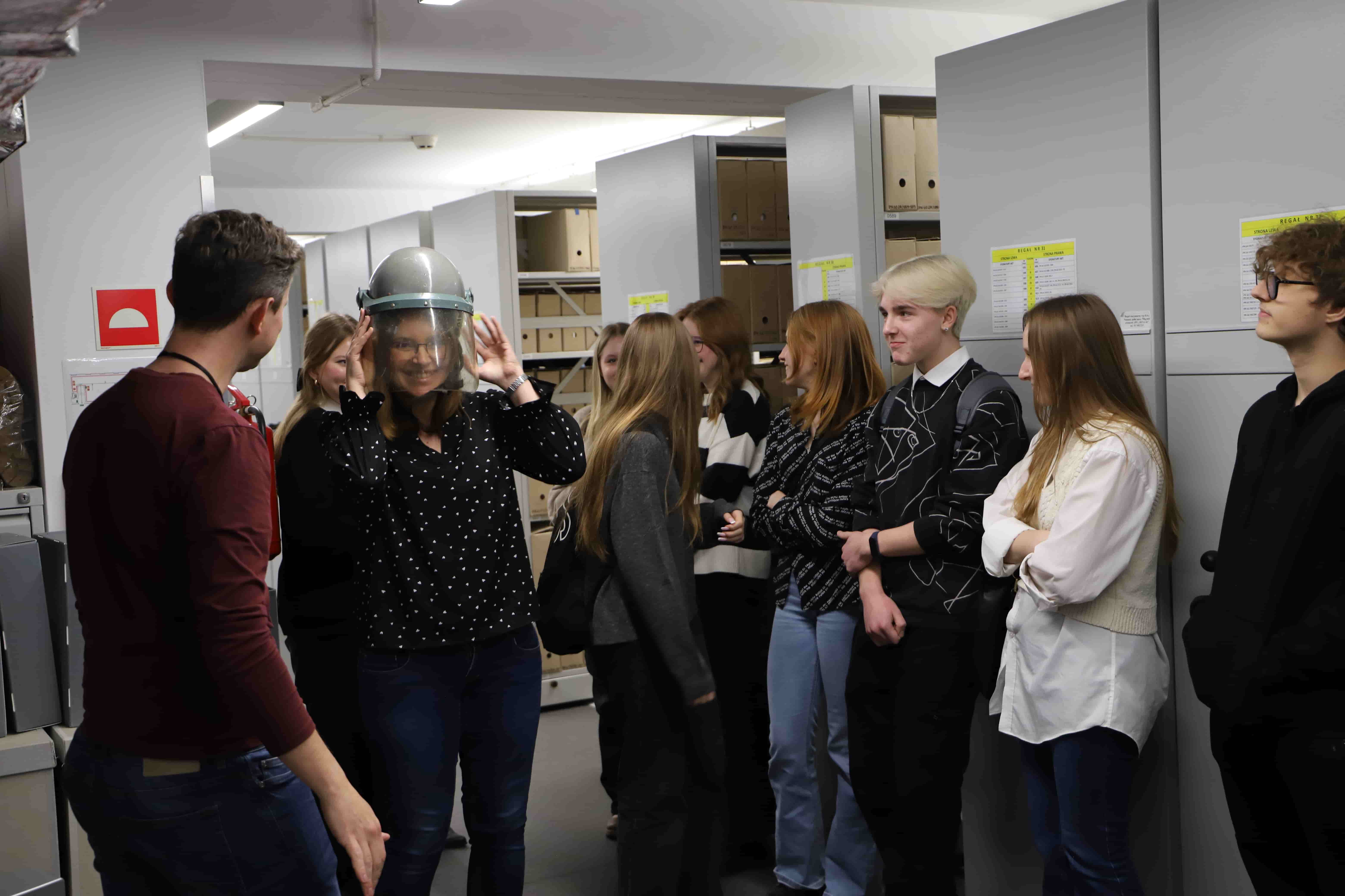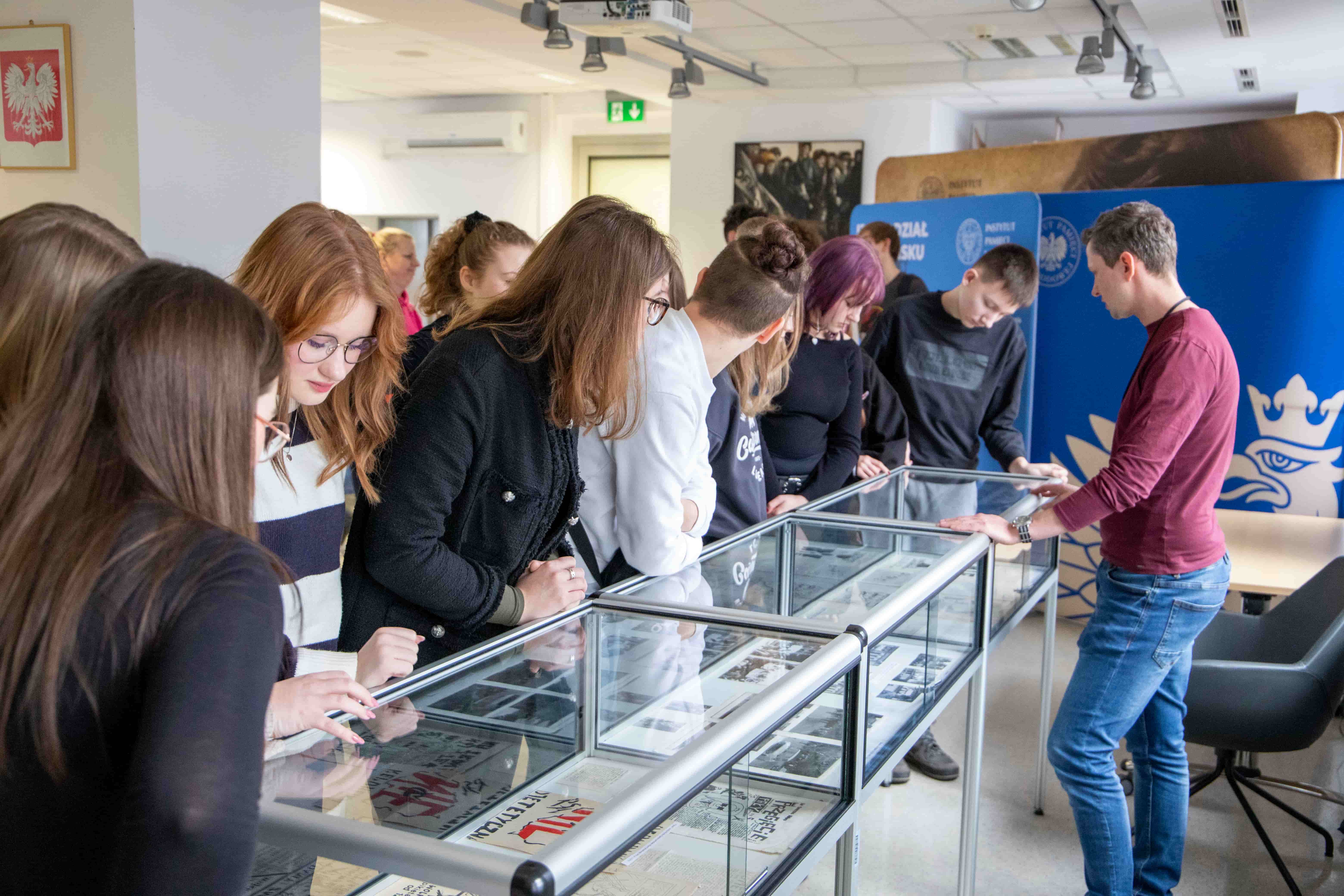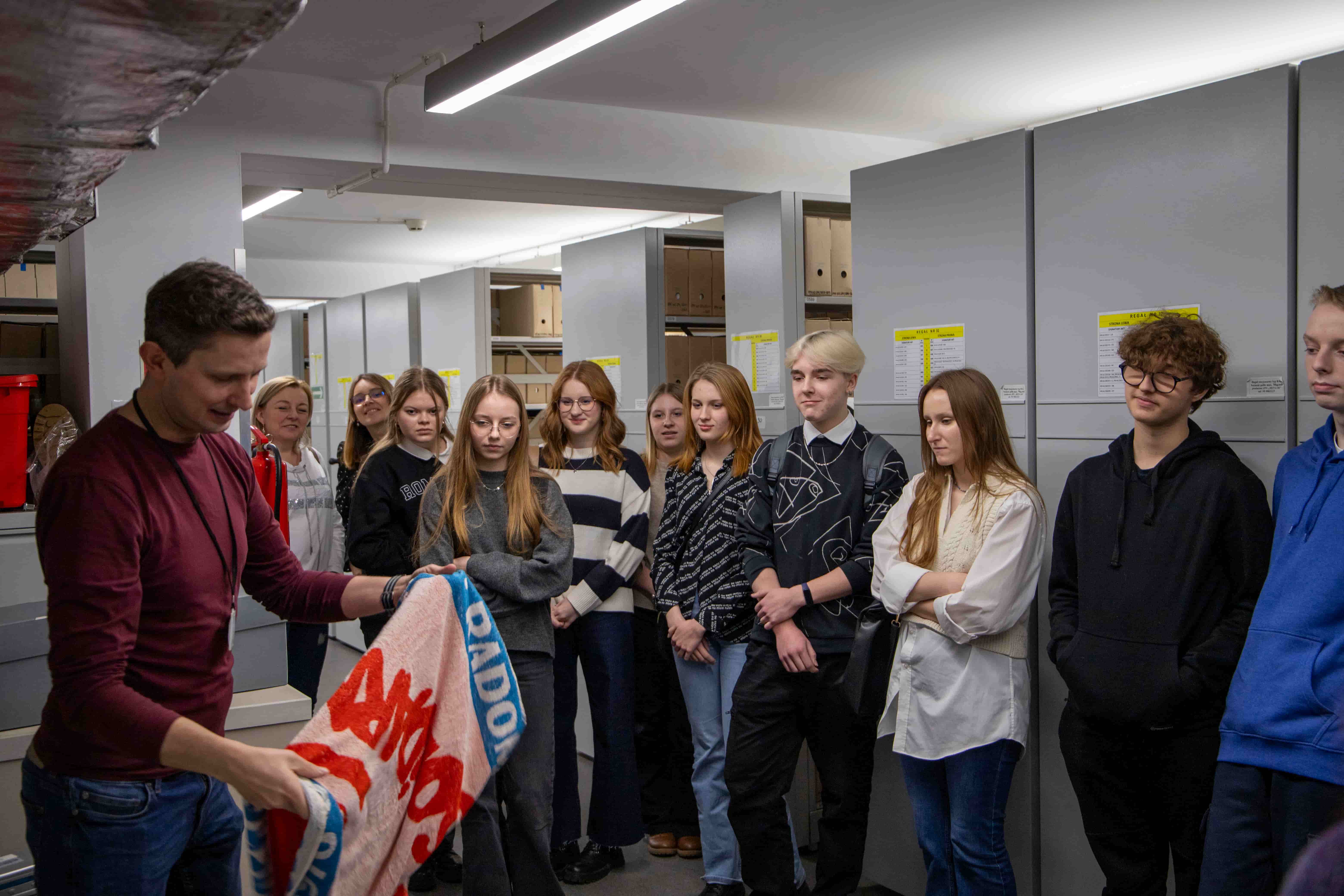 Dodatkowo w ramach zajęć w naszym oddziale uczniowie zwiedzili również magazyny archiwalne i mieli okazję obejrzeć oryginalne pamiątki z lat 1853-1989, przekazane przez darczyńców do zasobu archiwalnego Oddziału IPN w Gdańsku w ramach projektu „Archiwum Pełne Pamięci”. Były to m.in. świadectwa, dyplomy, dokumenty tożsamości, legitymacje, przypinki o tematyce religijnej i solidarnościowej, znaczki pocztowe wydane przez ugrupowania opozycyjne, kartki żywnościowe, pamiątkowy ręcznik poświęcony I Krajowemu Zjazdowi Delegatów NSZZ „Solidarność” w 1981 r.