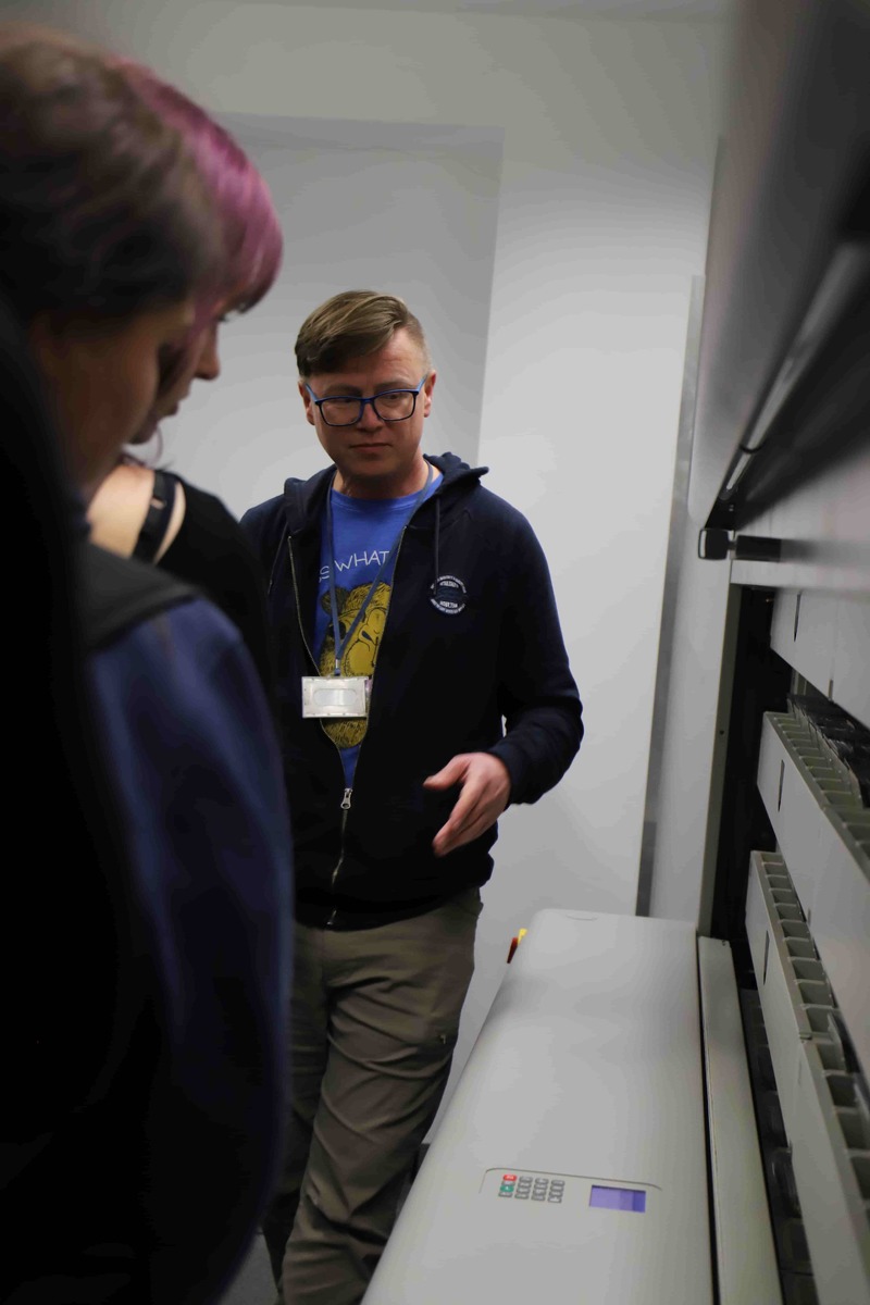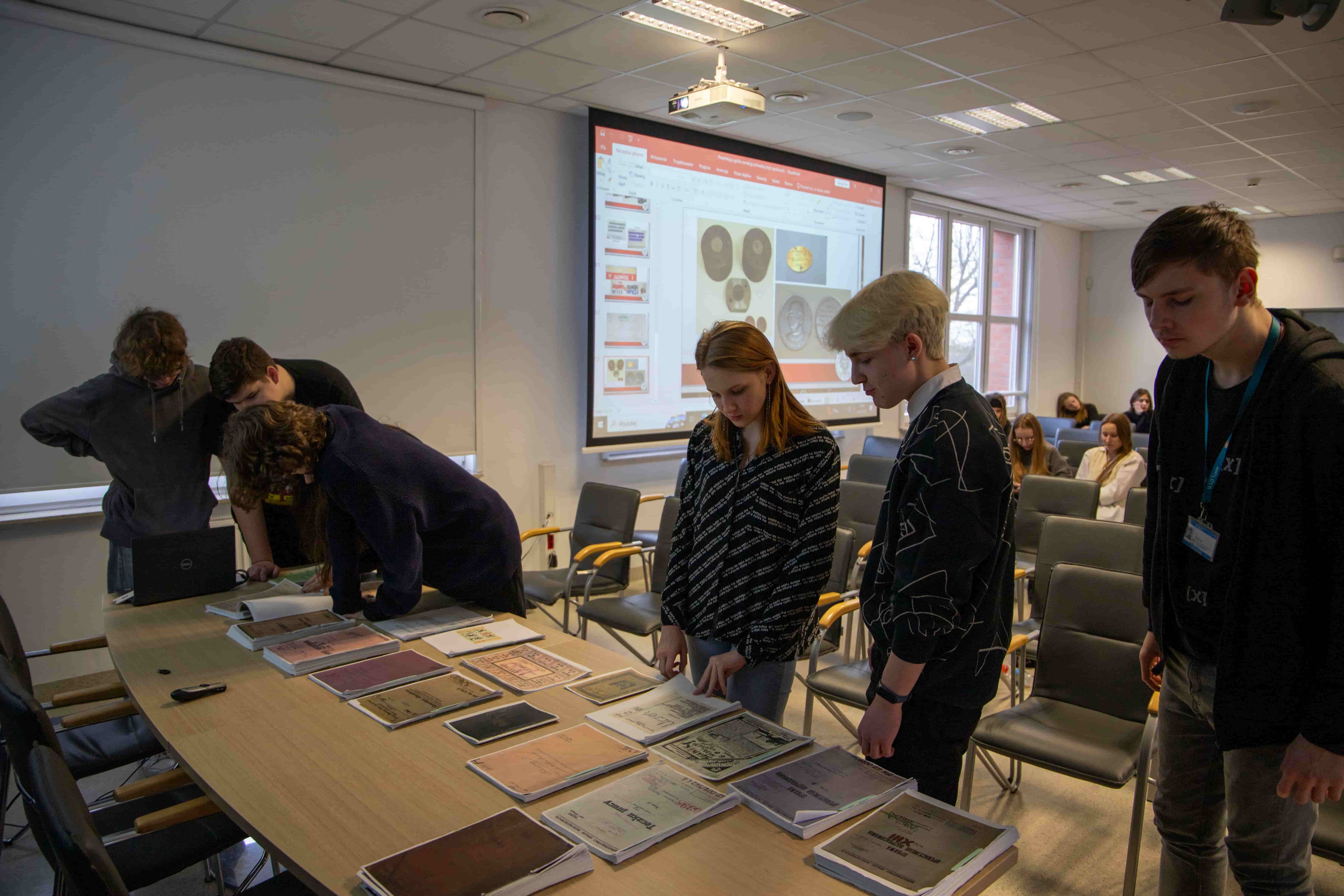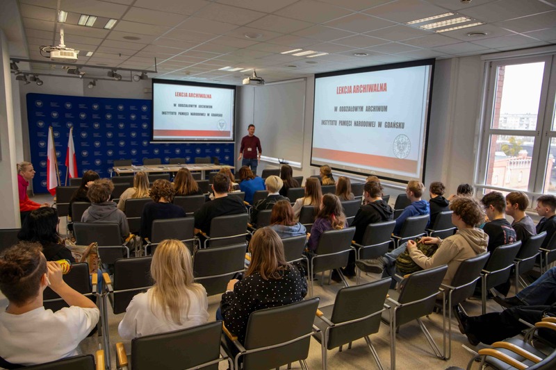 Pracownik Oddziałowego Archiwum Radosław Szumiło poprowadził lekcję archiwalną z prezentacją multimedialną, podczas której opowiedział o zadaniach spoczywających na archiwistach i scharakteryzował poszczególne rodzaje dokumentów, zgromadzonych w zasobie Oddziału IPN w Gdańsku.