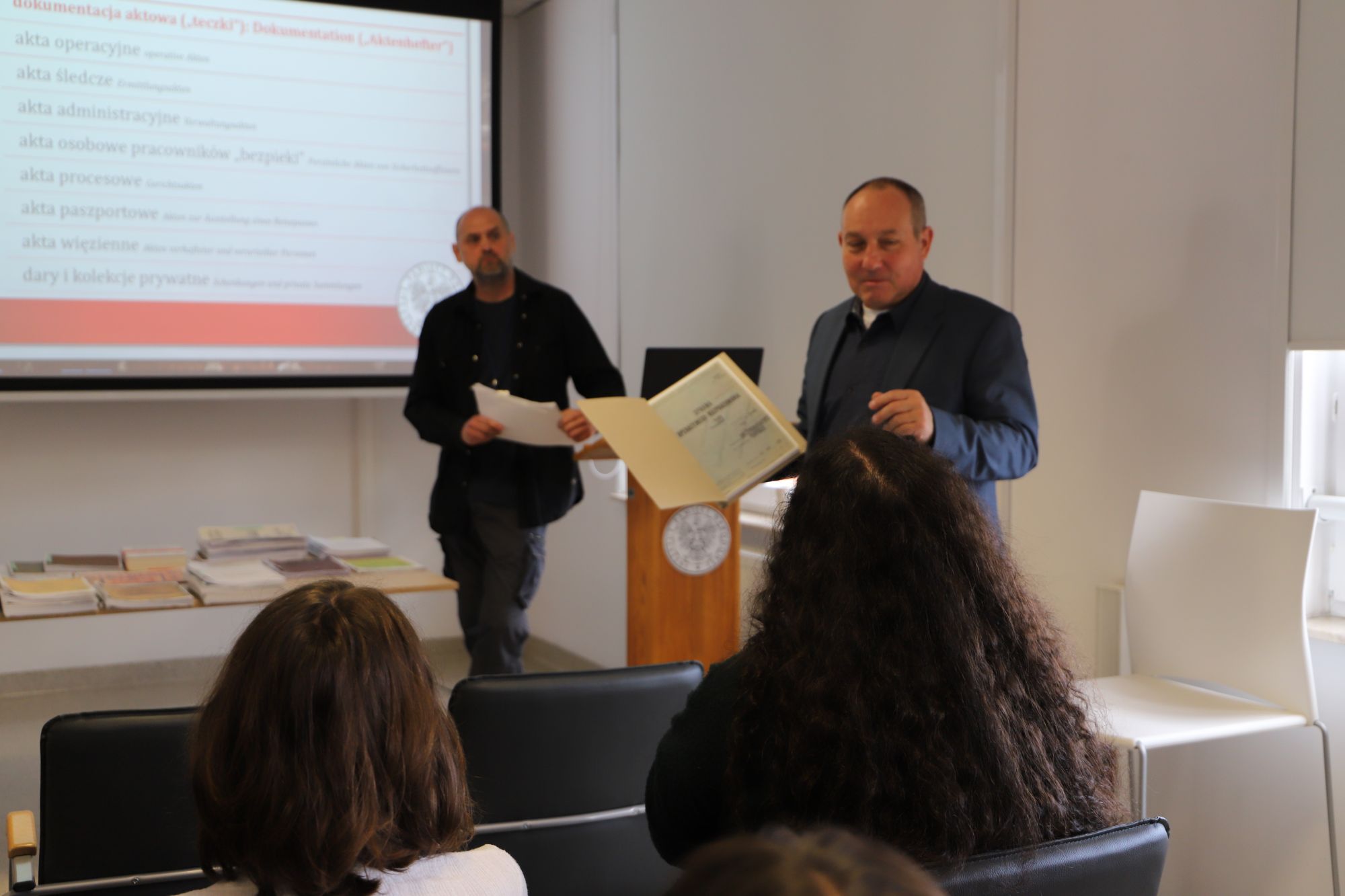 Naszych gości przywitała Justyna Pazda Naczelnik Oddziałowego Archiwum, która przedstawiła strukturę oraz zadania ustawowe Instytutu Pamięci Narodowej. Następnie Maciej Sokołowski omówił szczegółowo organizację pracy Instytutu oraz zakres i sposób jej realizacji przez poszczególne piony. W dalszej części opowiedział o zgromadzonym zasobie archiwalnym i scharakteryzował poszczególne rodzaje dokumentów. Studenci obejrzeli kopie wybranych materiałów archiwalnych m.in. akta operacyjne Służby Bezpieczeństwa, akta sądowe, akta funkcjonariusza Służby Bezpieczeństwa, akta tajnego współpracownika i akta paszportowe.