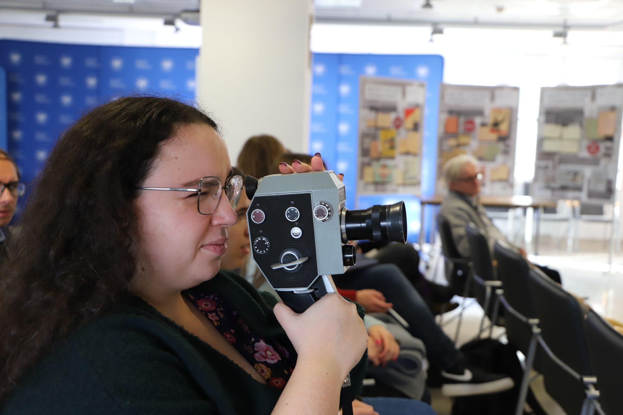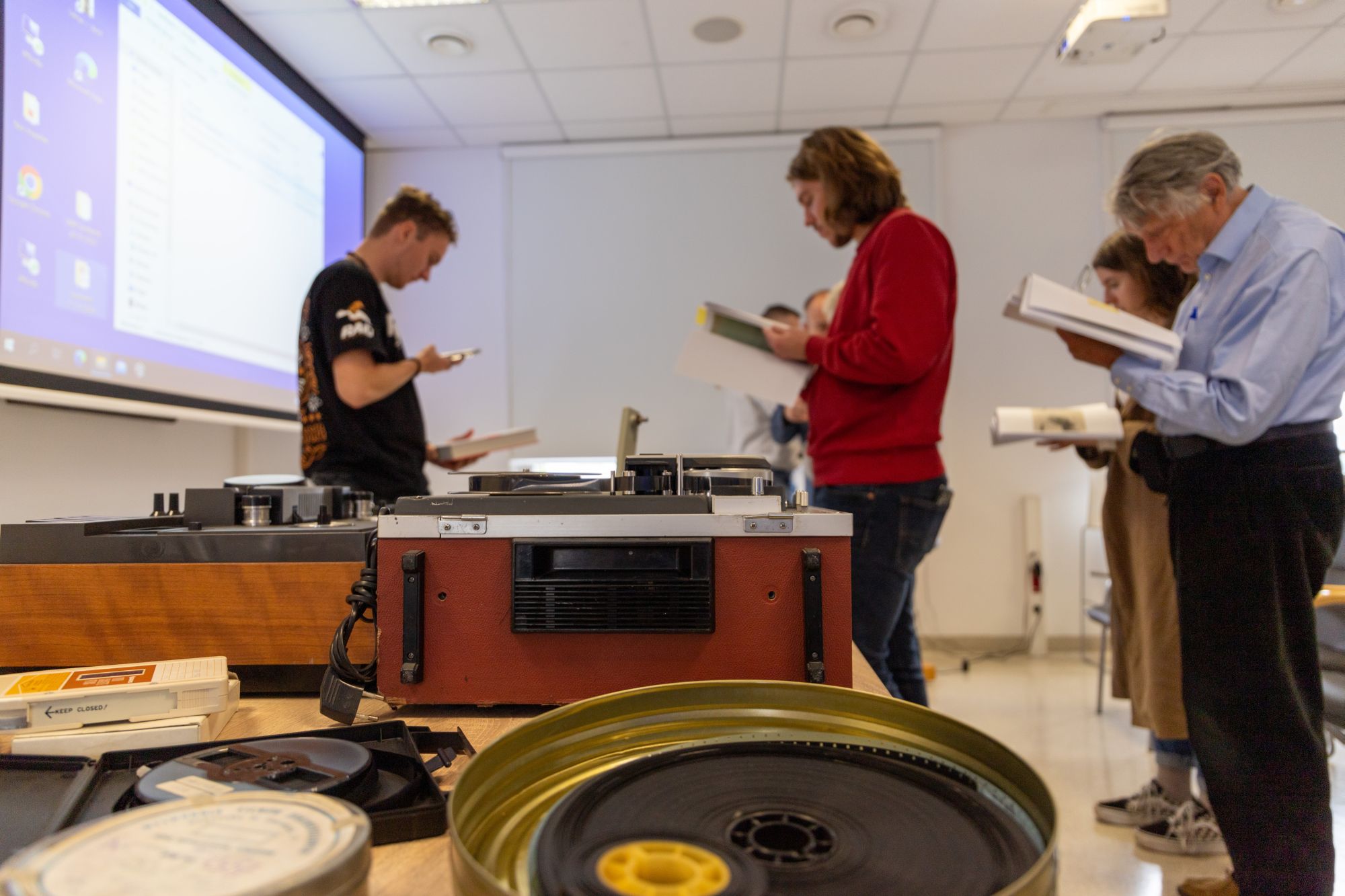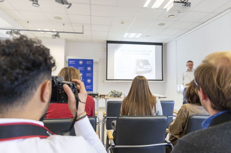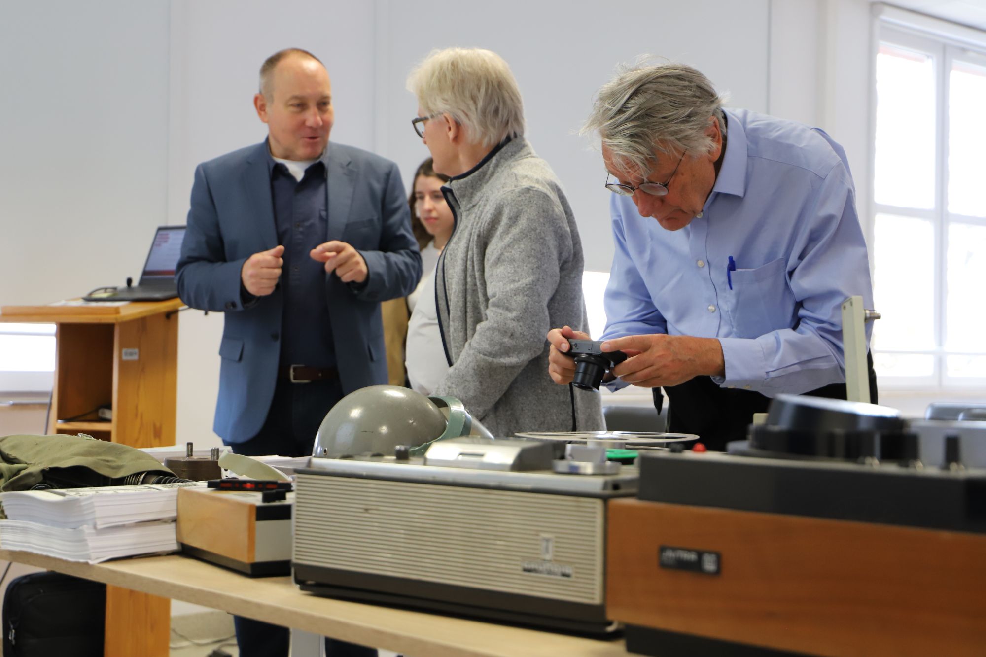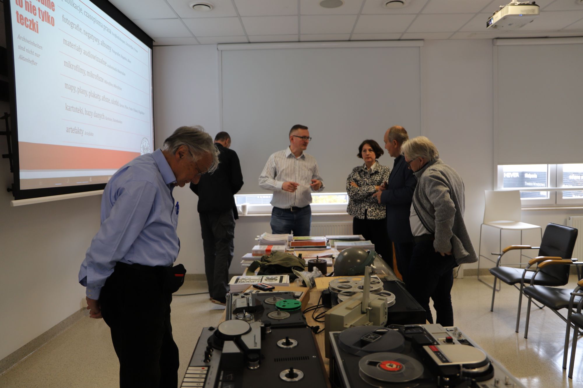 Kolejny etap wizyty był poświęcony materiałom audiowizualnym zgromadzonym w naszym archiwum. Ich prezentację przedstawił Grzegorz Kuźma. Nasi goście zapoznali się z rodzajami dokumentacji filmowej i dźwiękowej tworzonej przez organa bezpieczeństwa PRL, celami jej powstania i technicznymi sposobami zapisu obrazu oraz dźwięku. Studenci mieli okazję obejrzeć sprzęt z okresu PRL oraz taśmy filmowe 8, 16 i 35 mm, kasety Sanyo VT-30C.