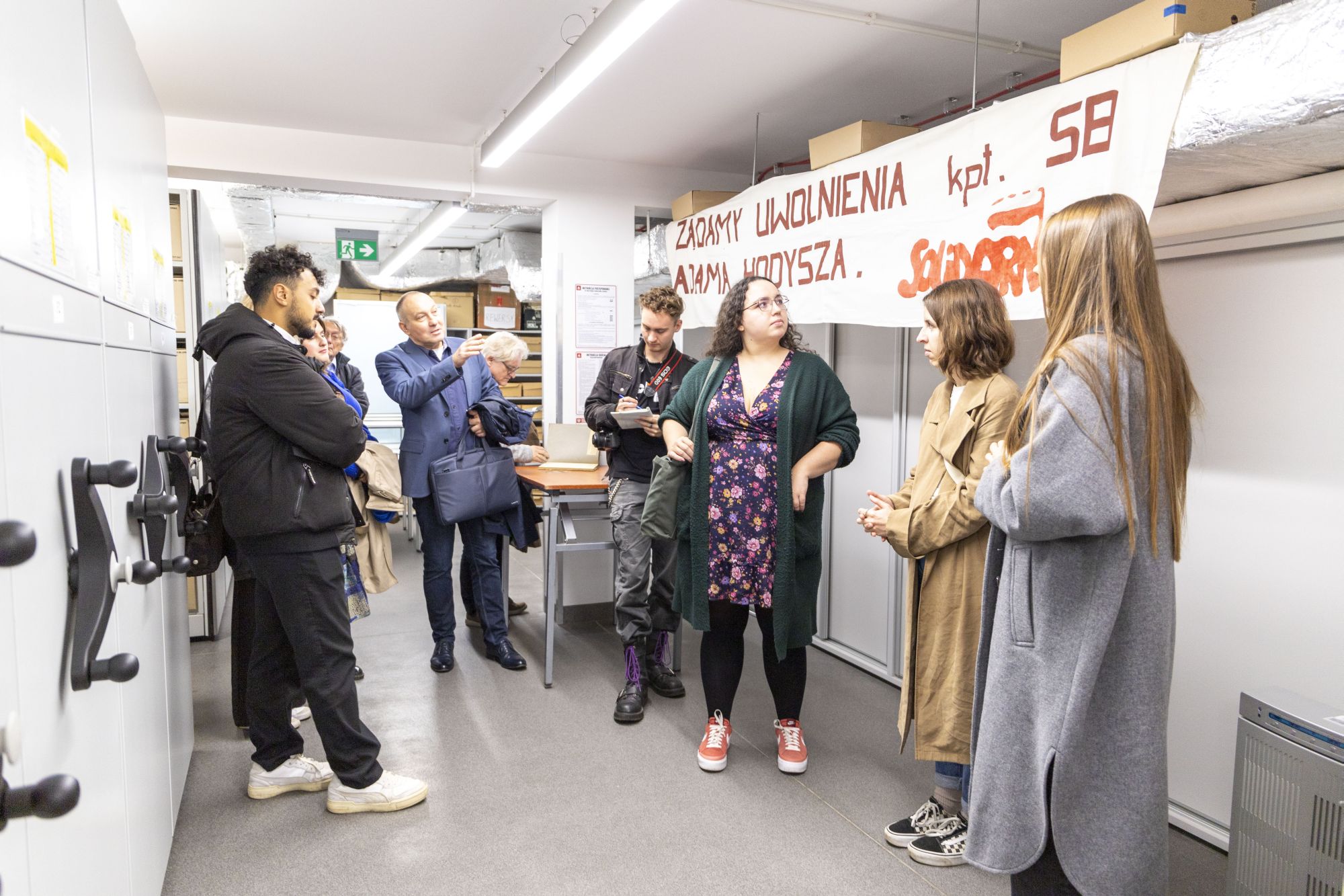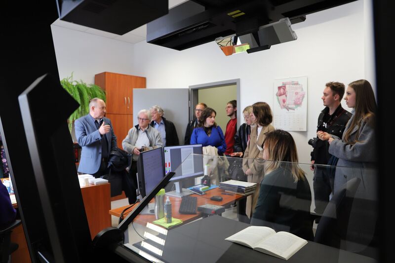 Studenci zwiedzili również magazyny archiwalne oraz kartoteczne, w których zaprezentowano wybrane artefakty. Przybliżono formy i warunki przechowywania oraz udostępniania zgromadzonego zasobu. Na koniec uczestnicy spotkania mieli okazję odwiedzić pracownie konserwacji i digitalizacji oraz obejrzeć pokaz działania skanera wielkoformatowego Zeutschel OS Q1.