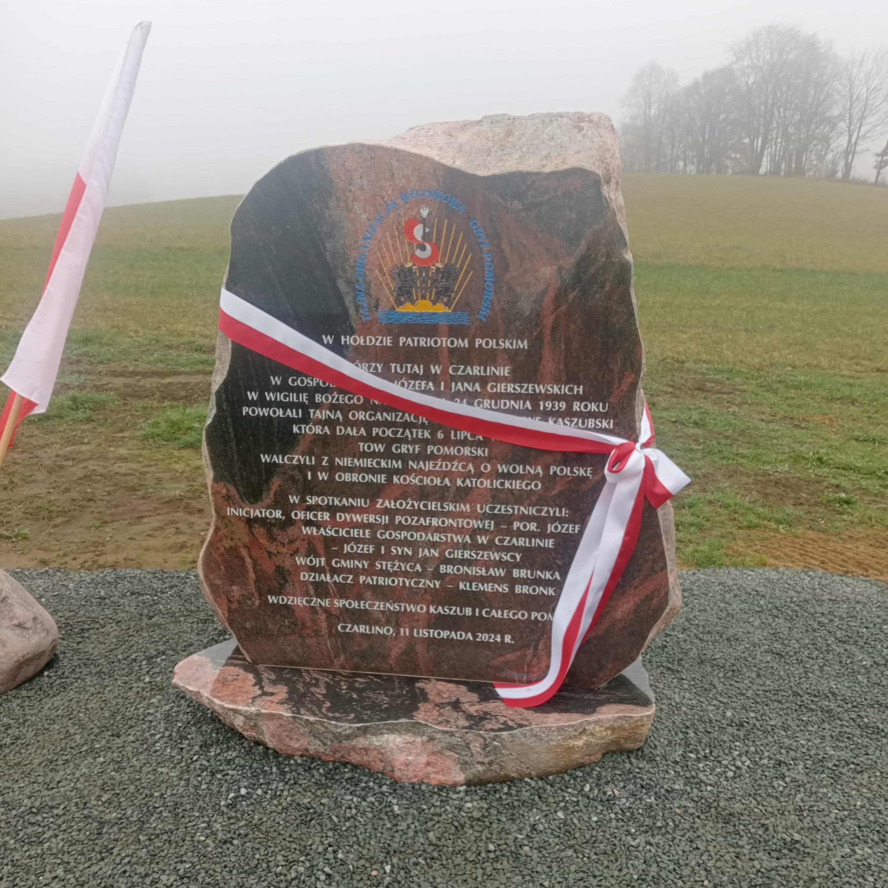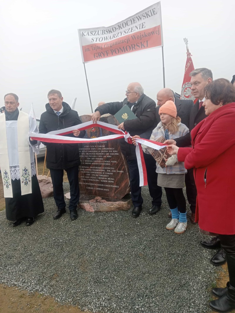 Pomnik stanął na terenie gospodarstwa Jarosława Hincy, gdzie 85 lat temu spotkanie założycielskie „Gryfa Kaszubskiego”. Inicjatorem upamiętnienia jest Kaszubsko - Kociewskie Stowarzyszenie im. Tajnej Organizacji Wojskowej „Gryf Pomorski”. W imieniu dyrektora Oddziału Gdańskiego IPN dr. Marka Szymaniak hołd bohaterom oddała Anna Kołakowska – pracownik Biura Upamiętniania Walk i Męczeństwa.