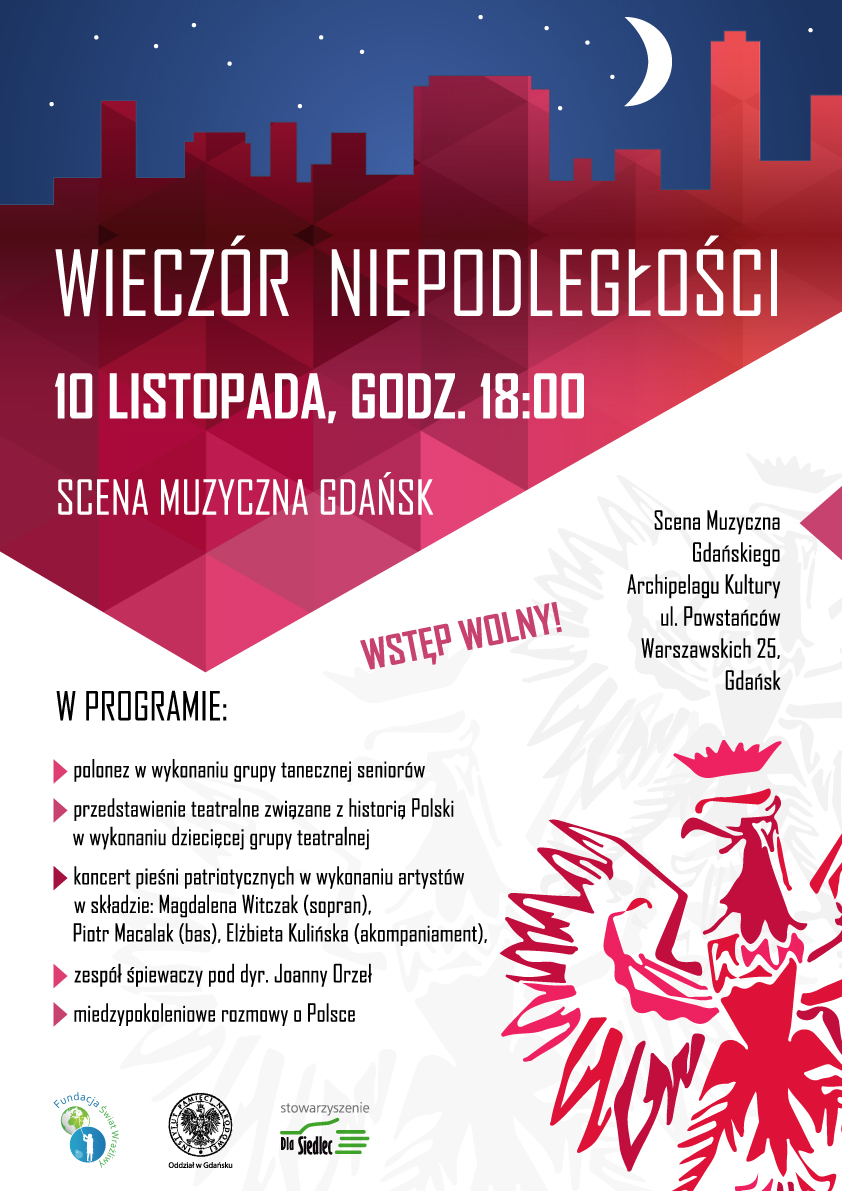 Narodowe Święto Niepodległości poprzedziło w dniu 10 listopada widowisko Wieczór Niepodległości na Scenie Muzycznej Gdańskiego Archipelagu Kultury. Goście wydarzenia obejrzeli polonez w wykonaniu grupy tanecznej seniorów, przedstawienie teatralne związane z historią Polski w wykonaniu dziecięcej grupy teatralnej, koncert pieśni patriotycznych w wykonaniu artystów (sopran – Magdalena Witczak, bas – Piotr Macalak, akompaniament – Elżbieta Kulińska) i zespół śpiewaczy pod dyrekcją Joanny Orzeł.