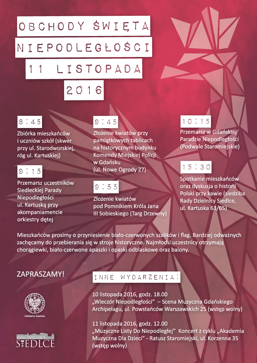 Gdański Oddział Instytutu Pamięci Narodowej aktywnie uczestniczył w organizacji Narodowego Święta Niepodległości. Po godz. 9 w dzielnicy Siedlce sformowała się z inicjatywy IPN i Rady Dzielnicy Siedlecka Parada Niepodległości. Jej uczestnicy przeszli ulicą Kartuską pod Pomnik Króla Jana III Sobieskiego. Po drodze złożyli kwiaty przy pamiątkowych tablicach na historycznym budynku Komendy Miejskiej Policji w Gdańsku i pod Pomnikiem Króla Jana III Sobieskiego.