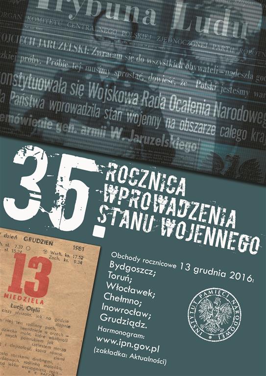 • 14.00 – wojewódzkie obchody 35. rocznicy wprowadzenia stanu wojennego (Kujawsko-Pomorski Urząd Wojewódzki, ul. Jagiellońska 3)