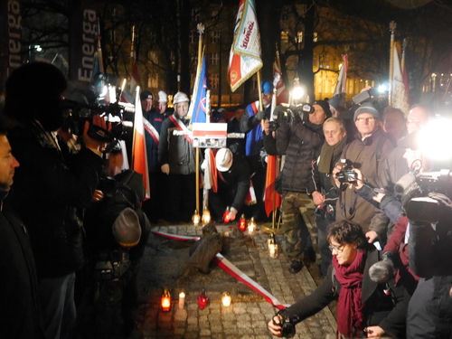Przed uroczystością odsłonięcia tablicy Ofiar Stanu Wojennego na Placu Solidarności