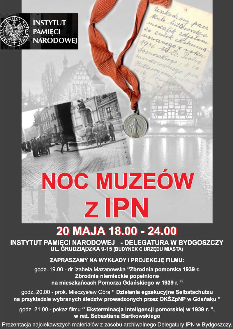 - 19.00 – dr Izabela Mazanowska „Zbrodnia pomorska 1939 r. Zbrodnie niemieckie popełnione na mieszkańcach Pomorza Gdańskiego w 1939 r.”