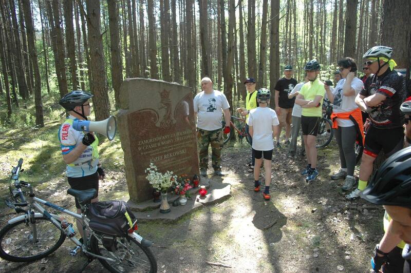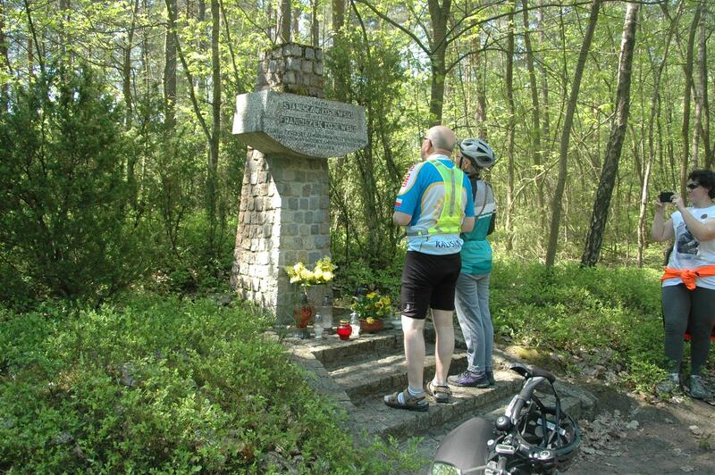 Następnie opuściliśmy wygodne asfaltowe drogi i wjechaliśmy na leśne ścieżki. W okolicach Kaliskiej PKP stanęliśmy pod pomnikiem upamiętniających zamordowanych w 1939 roku Polaków. Dalej po przejechaniu przez las dotarliśmy do szosy Kaliska-Czarna Woda. Nasi przewodnicy określili to miejsce jako początek rajdu „Żelaznego”. W tej okolicy zarekwirował on ciężarówkę „Bedford”, dzięki której rozbroił potem 7 posterunków MO i 2 siedziby UB.