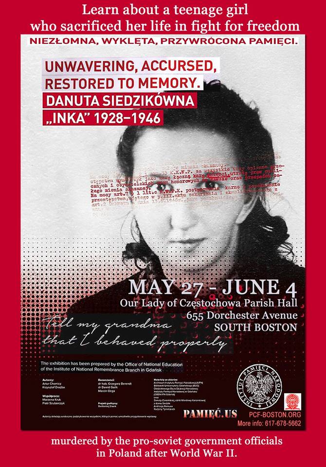 Dzięki staraniom Grzegorza Tymińskiego, twórcy portalu pamiec.us, a także członkom Fundacji Kultury Polskiej w Bostonie, gdańska wystawa IPN o Danucie Siedzikównie „Ince” dotarła na wschodnie wybrzeże Stanów Zjednoczonych. Jak zapewniają nas twórcy wystawy, będzie ona dostępna w sali pod kościołem pw. Matki Boskiej Częstochowskiej przy 655 Dorchester Avenue od 27 maja do 4 czerwca br. Można ją będzie zwiedzać w niedzielę 28 maja i 4 czerwca oraz w pozostałych dniach po wcześniejszej rezerwacji.