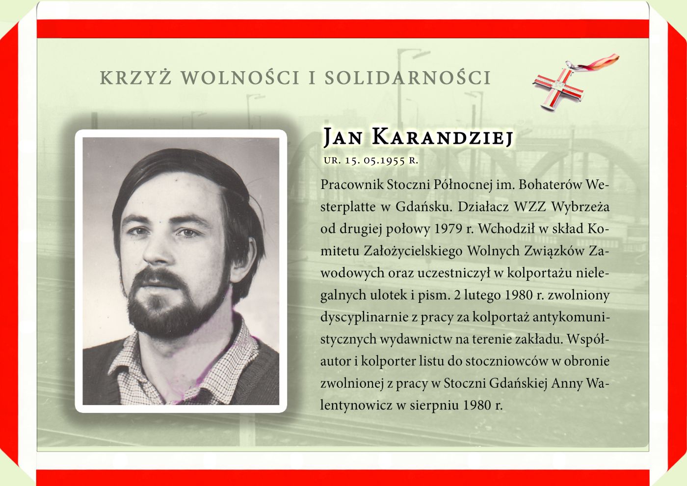 Dlatego cieszę się, że w tych dniach kolejne osoby związane z Wolnymi Związkami Zawodowymi otrzymają Krzyż Wolności i Solidarności. Pamięć o Państwa zasługach jest naszym zobowiązaniem – ale jednocześnie to, że możemy dziś, kształtując przyszłość Polski, odwoływać się do tak chlubnej i budującej tradycji, jest naszym wielkim przywilejem. Chcę dziś za to w imieniu wszystkich Polaków bardzo podziękować. Państwa poświęcenie sprawie wolności i solidarności pozostaje dla nas drogowskazem w budowaniu sprawiedliwej i solidarnej Rzeczypospolitej.