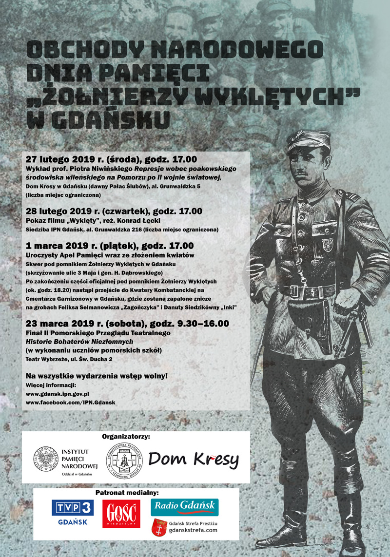 - 1 marca o godz. 17.00 uroczysty Apel Pamięci przy oficjalnie odsłoniętym rok temu Pomniku Żołnierzy Wyklętych w Gdańsku. Następnie uczestnicy uroczystości przejdą na Cmentarz Garnizonowy, by złożyć kwiaty i zapalić znicze na grobach bohaterów Danuty Siedzikówny „Inki” i Feliksa Selmanowicza „Zagończyka”. W programie wystąpienie okolicznościowe prof. Mirosława Golona oraz modlitwa z udziałem kapłana. O 18.30 w parafii oo. salezjanów przy ul. Gościnnej nr 15 odprawiona zostanie uroczysta Msza św., a po niej tradycyjnie złożone zostaną kwiaty pod pomnikiem Danuty Siedzikówny "Inki" na przykościelnym placu;