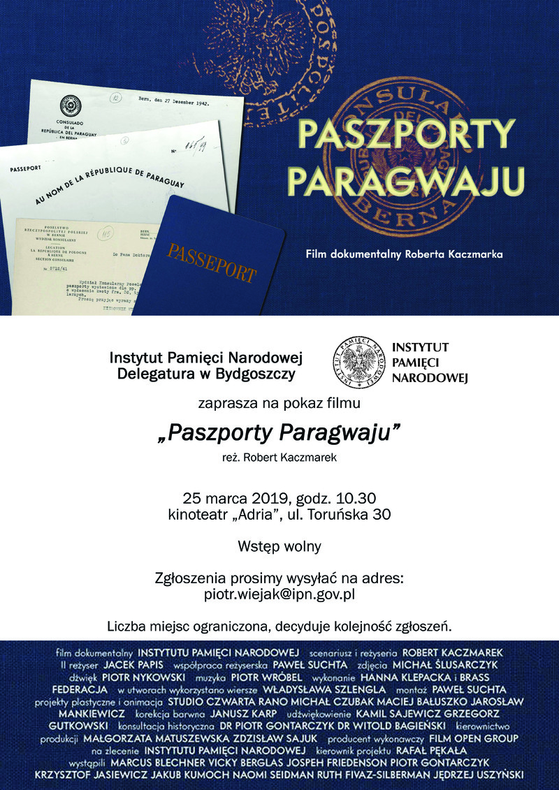 Dyrektor Oddziału IPN w Gdańsku prof. Mirosław Golon ma zaszczyt zaprosić na pokazy filmu „Paszporty Paragwaju” (reż. Robert Kaczmarek) w ramach Obchodów Narodowego Dnia Pamięci Polaków ratujących Żydów pod okupacją niemiecką.