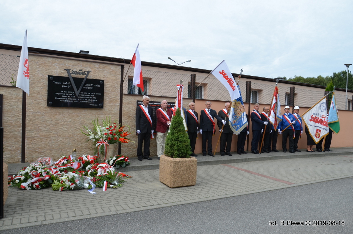 Spotkanie przy tablicy pamiątkowej na murze dawnego obozu internowanych.