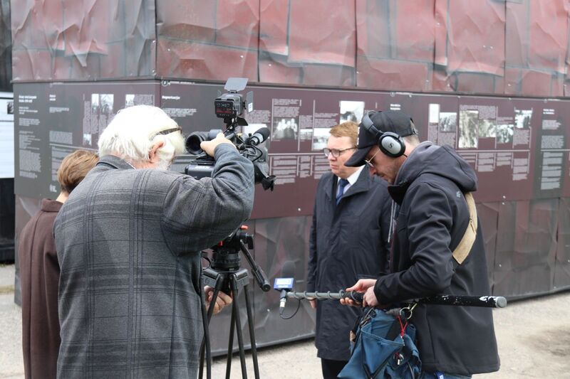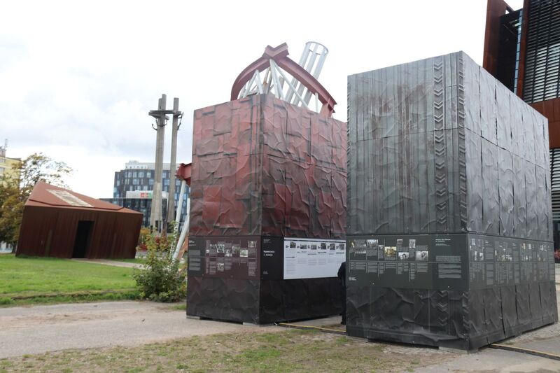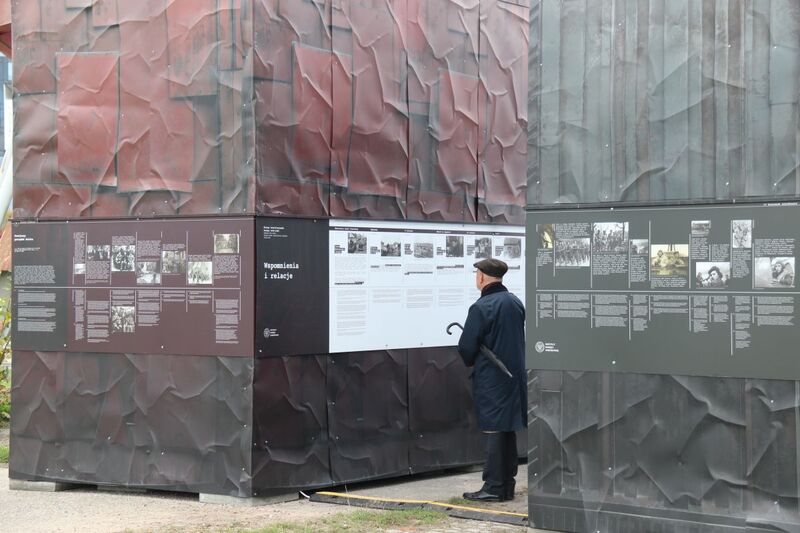 W dramatyczne realia wojny wprowadzają teksty kuratorskie i fotografie, umieszczone na zewnętrznych ścianach instalacji.