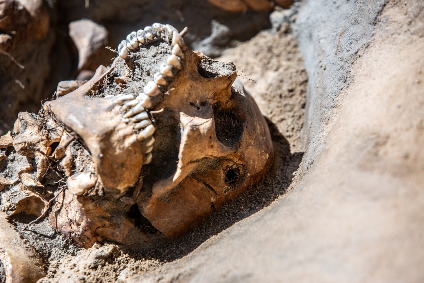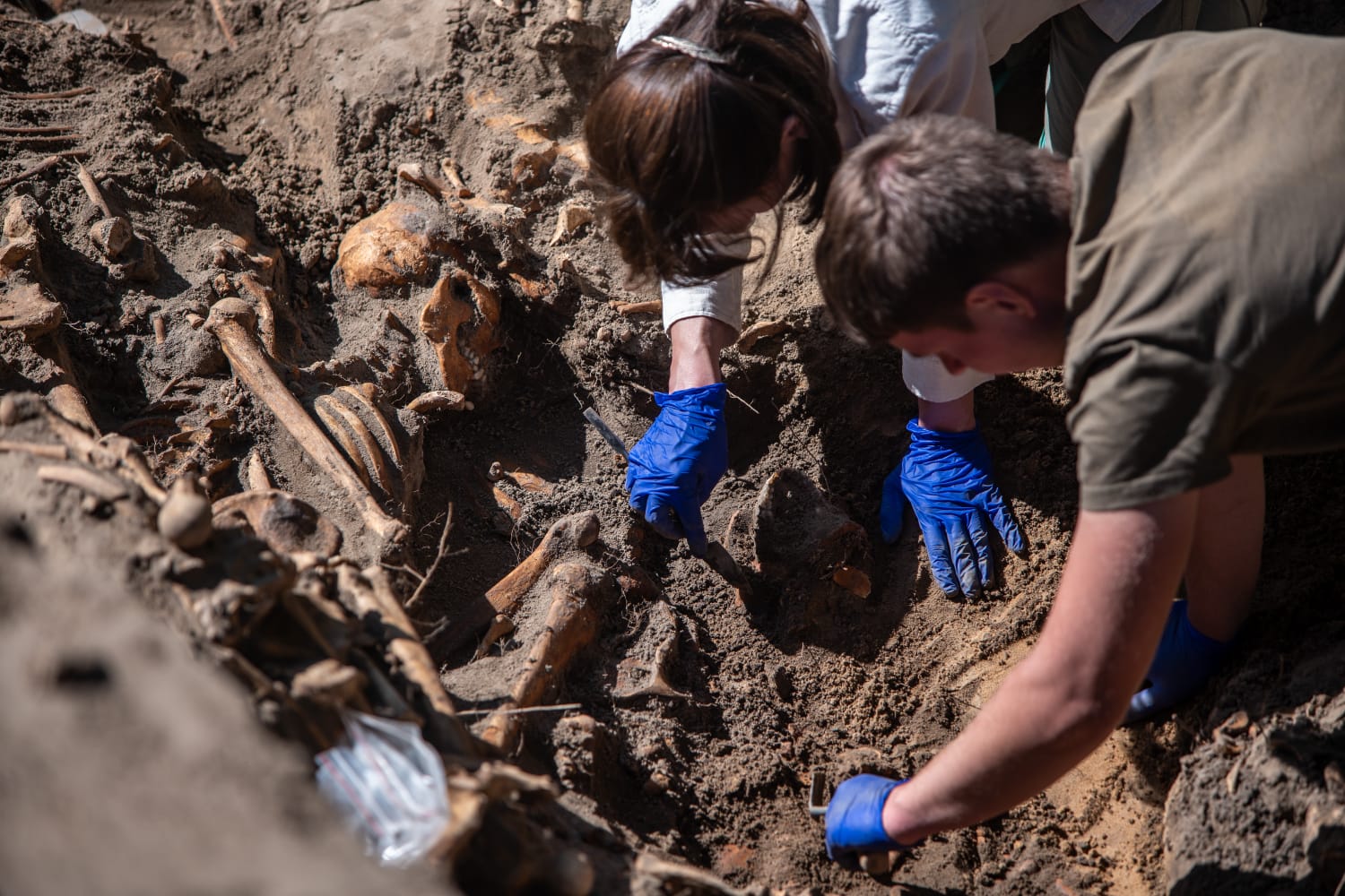 Human remains were scattered within a dozen or so meters. The Germans intentionally chose the part where the trench reached a depth of 1.5 to over 2 metres. This was the level where the remains of the victims were found. In the mass grave, the human skeletal remains of at least 80 people and the skeletons of about 50 people were recovered from the ground. The remains were mostly buried in layers, one on top of the other. Four clusters of bones without an anatomical arrangement were uncovered. The skeletal remains were placed on their backs or on their bellies, and one on the side, with varying degrees of completeness. Traces of injuries were revealed on some of the skulls and some long bones of the limbs; they are cracked, fragmented, with entry/exit holes visible on the skulls. A decision to continue exhumation works will be made in the near future.