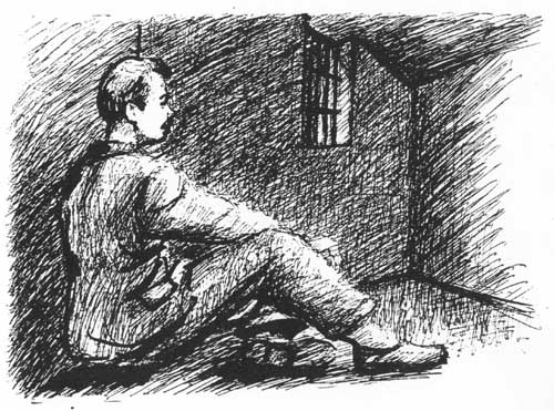 5. Józek w celi. Obok śledczy wojewódzkiego UB w Szczecinie. Rys. J. Obacz.
