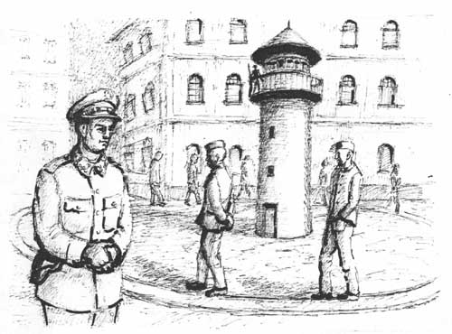 4. Więźniowie na spacerniaku w Nowogardzie. Rys. J. Obacz.