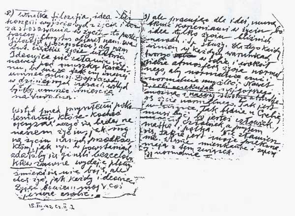„Wszelka filozofia, idea, bez korzeni wyjściowych z życia i bez zastosowania w życiu - to puste frazesy. Chrystus objawił nam swą filozofię pozagrobową, aby nam tutejsze ciężkie życie ułatwić. Ideowiec nie załamie się nawet pod muszką karabinu, bo wie, że tak czy inaczej umrzeć musi. Doprawdy, w dzisiejszych czasach wstyd byłoby umrzeć śmiercią naturalną. Wstyd przed przyszłemi pokoleniami, które kochać Ojczyznę uczyć się będą po naszem życiu - jak my na życiu naszych przodków, którzy, na przykład w powstaniach ginęli, zdawałoby się, bezcelowo. Krew zawsze wydaje plony. Śmierci się nie boję, ale chcę żyć - jak każdy ideowiec. Żyjąc bowiem, mogę coś jeszcze zrobić.